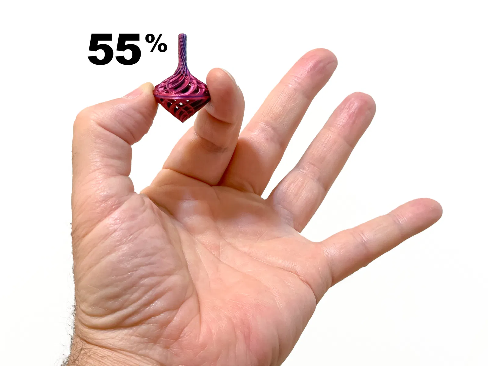 Để phần stem của bản 55% in cho ngon, mình tạo thêm một phiên bản STL mới với stem dày hơn. Mình có thêm một dòng GCODE giảm nhiệt đầu in xuống 180C ở layer height 10.50mm. Cái này có thể gây vấn đề với những loại filament cần nhiệt độ cao hơn. Cách đó hiệu quả khá tốt, nhưng mình cũng thấy in 2 cái cùng lúc còn cải thiện chất lượng phần stem hơn nữa. Vì vậy, file 3MF và GCODE mình cung cấp cho bản 55% sẽ có chi tiết cho 2 con top.