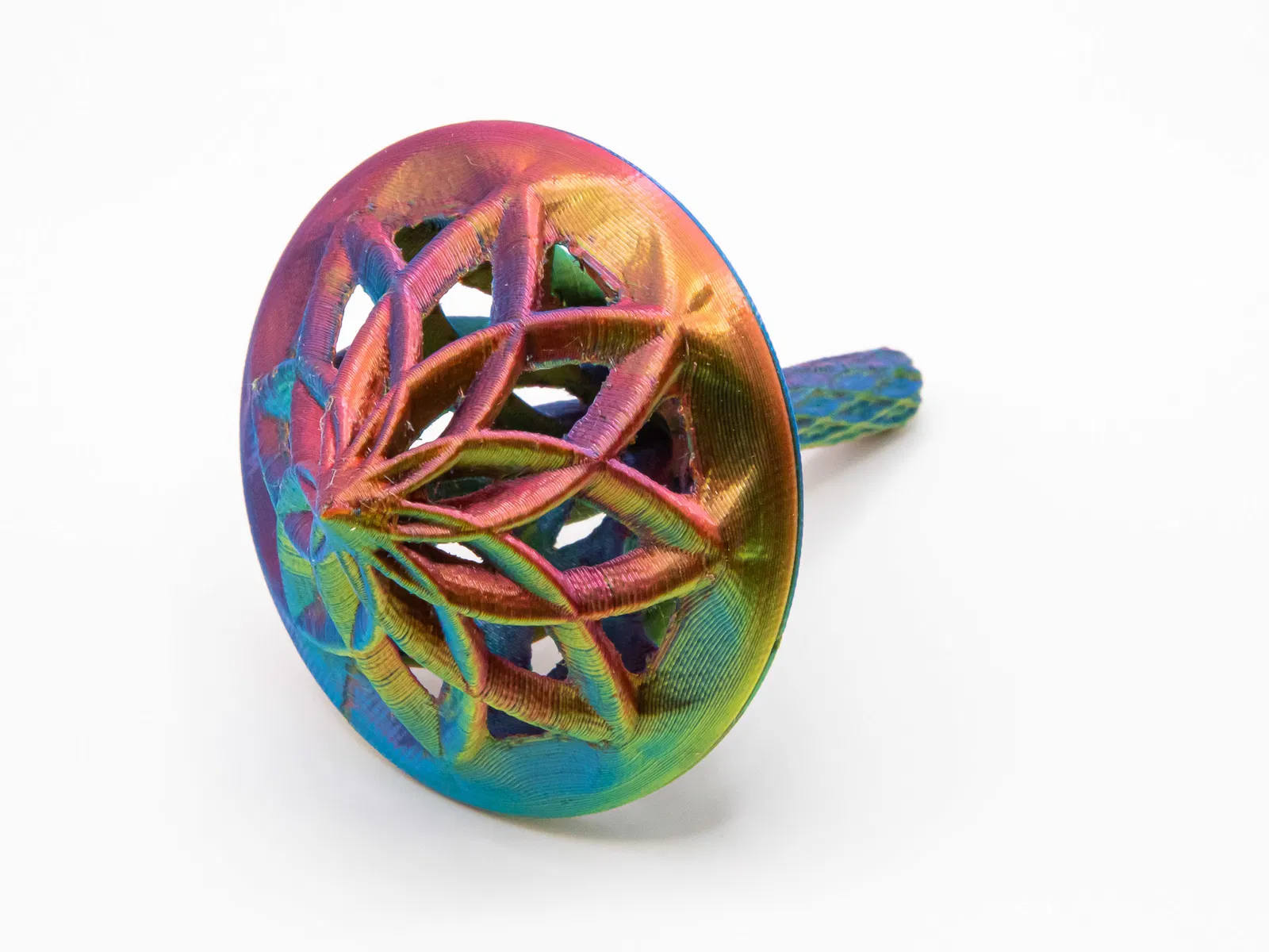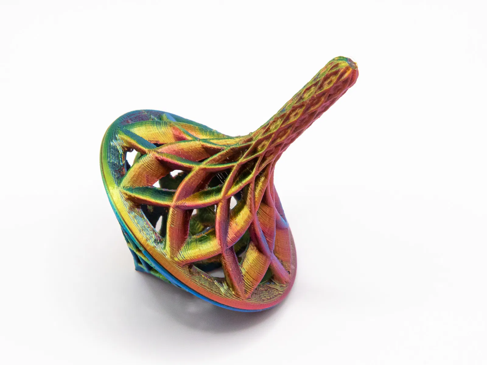 Nếu ai tò mò: mình dùng OVV3D Tri-color Red-Yellow-Blue Silk PLA cho mẫu top 1 màu. Lúc quay, PLA này nhìn hơi tím xám, nhưng khi đứng yên thì thấy đủ dải rainbow.