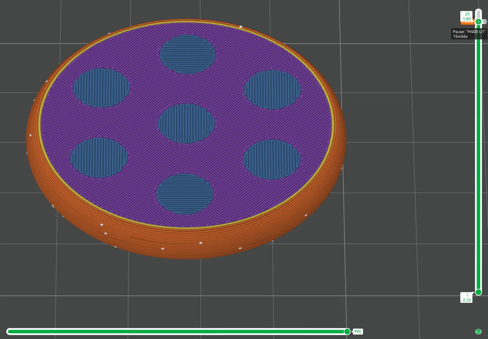 (trong PrusaSlicer và Bambu Studio: bấm chuột phải lên thanh trượt layer ở cửa sổ preview, tại layer đầu tiên sau phần “nắp” che lỗ, chọn “insert pause” (máy sẽ pause trước khi in layer đã chọn))