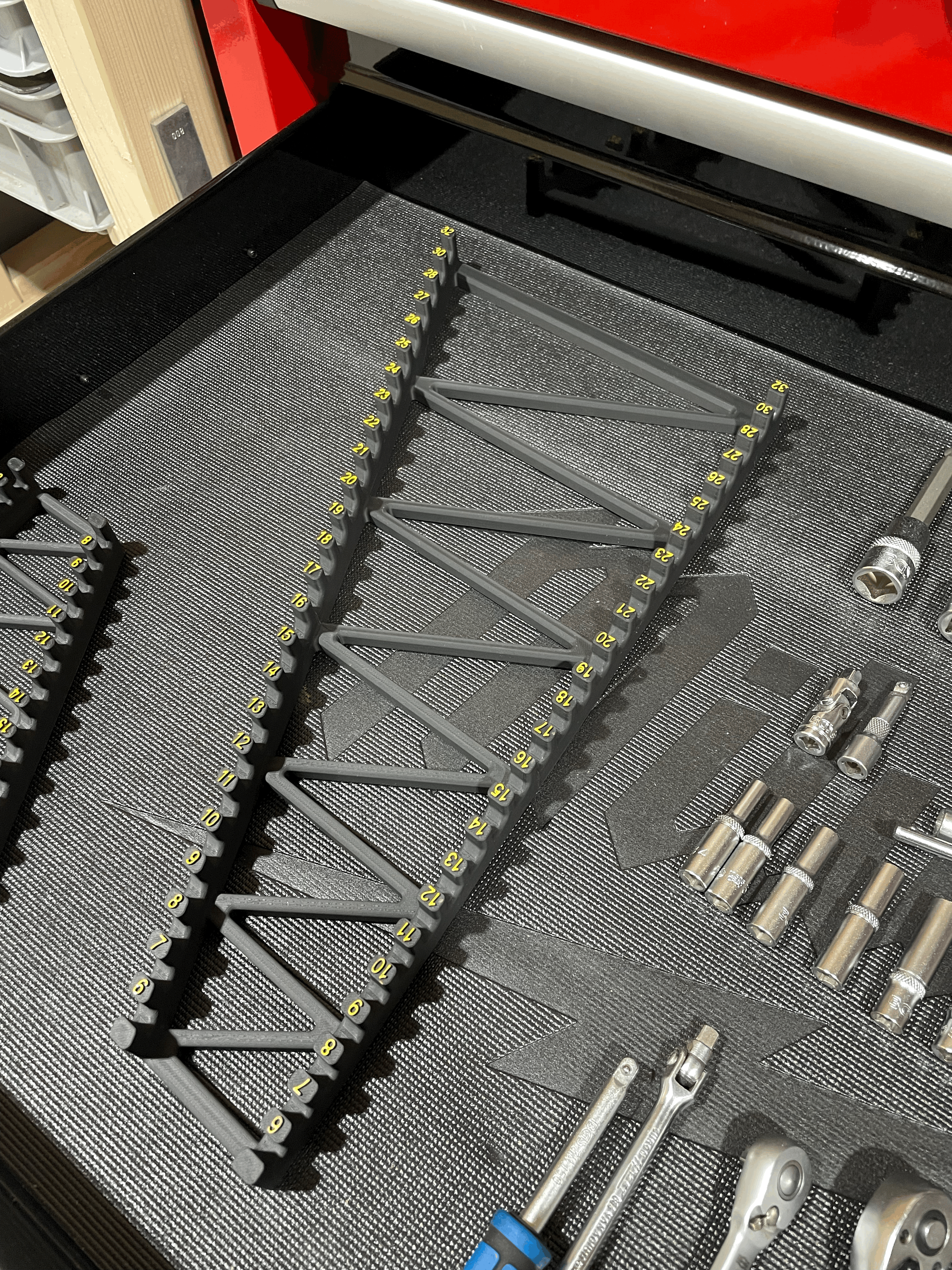 Khay organizer đơn giản để sắp xếp trọn bộ cờ lê từ 6–32mm theo thứ tự size, dễ lấy và gọn gàng. In 2 phần, phần lớn vừa sát khổ 256×256mm của BambuLab; dán keo là ráp nhanh.