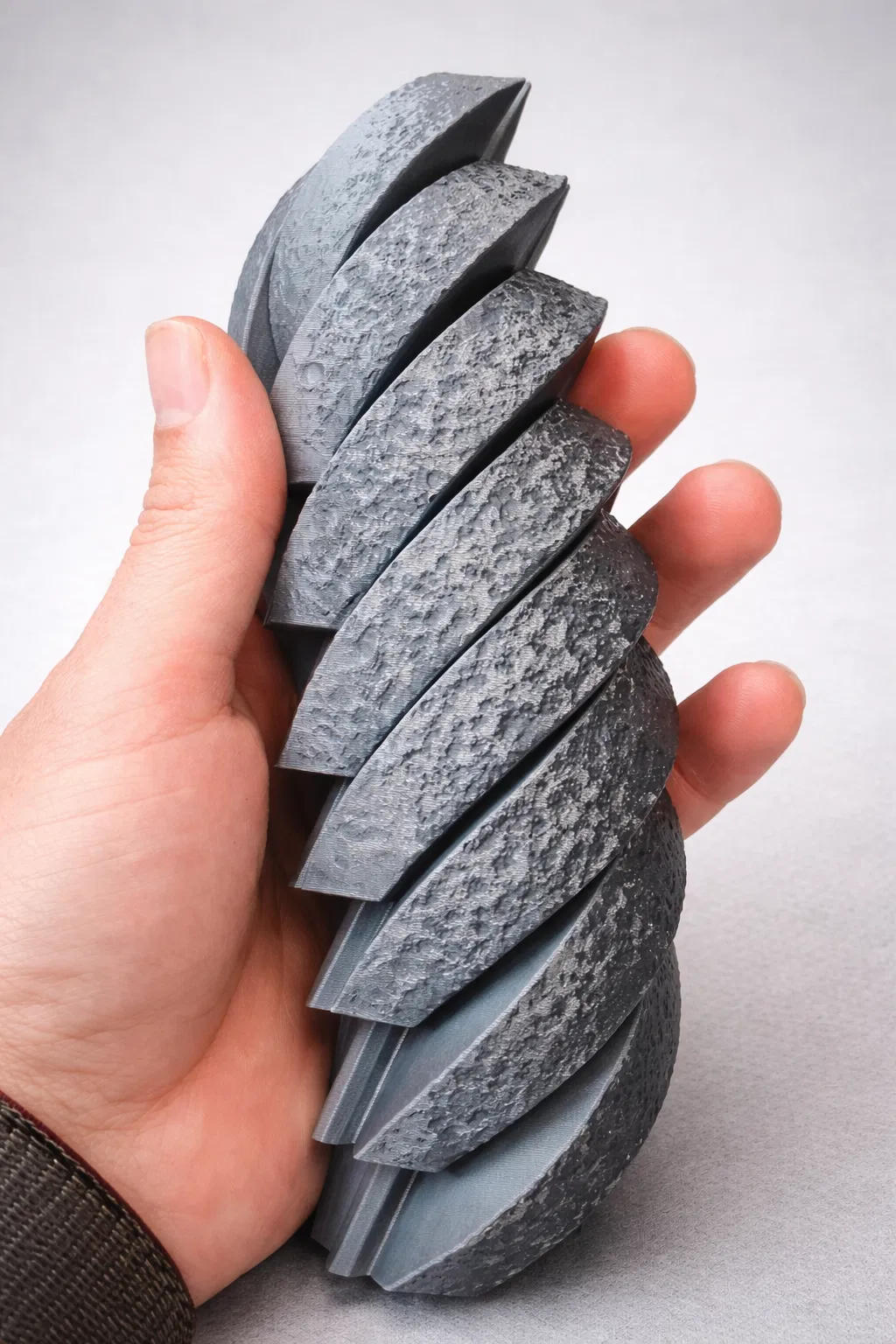 Mẫu in ra là một khối đã lắp sẵn (single assembled piece) và không cần supports. Kết cấu linh hoạt hoạt động ngon lành ngay khi vừa lấy khỏi bàn in, nên đây là một bản in vui và ổn định cho mọi mức kinh nghiệm. Bề mặt vân kiểu mặt trăng tạo điểm nhấn thị giác nhưng vẫn giữ vẻ sạch sẽ, tối giản.