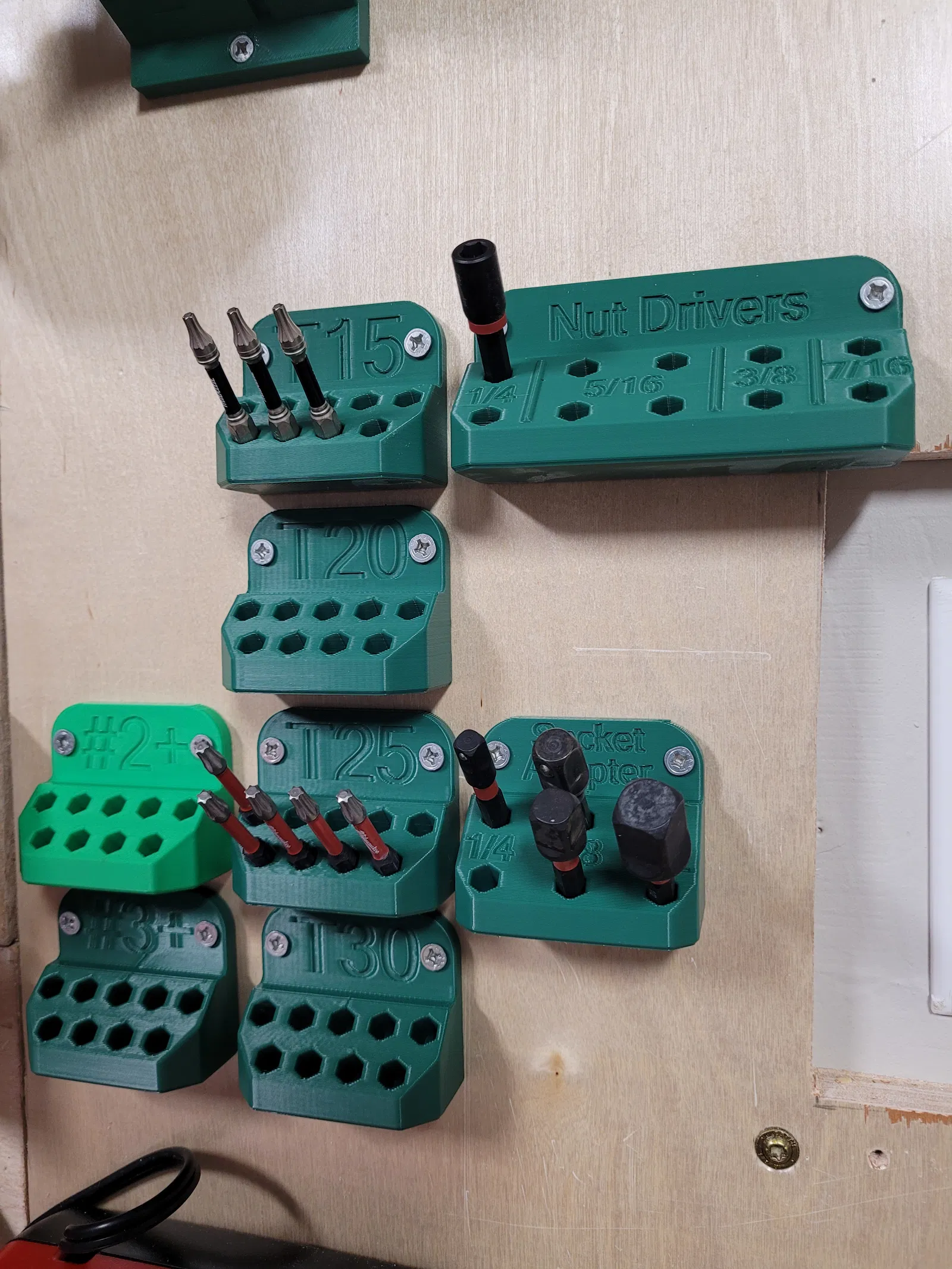 Kệ treo tường đựng hex bit cho phillips, standard, torx, socket adapter và nut driver. Thiết kế in đặt đáy, có thể in lật mặt lưng để đổi màu chữ. Có thêm Square drive, Step Bit Holder và ECX #1/#2.