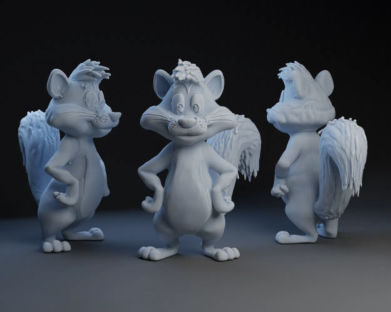 Mẫu skunk phong cách Looney Tune do AI tạo, gần giống Pepe le Pew. Tác giả tinh chỉnh thêm trong Blender với color UV map và displacement, rồi sculpt để tạo noise ngẫu nhiên và hiệu ứng bóng đổ. Tổng thời gian khoảng 30 phút.