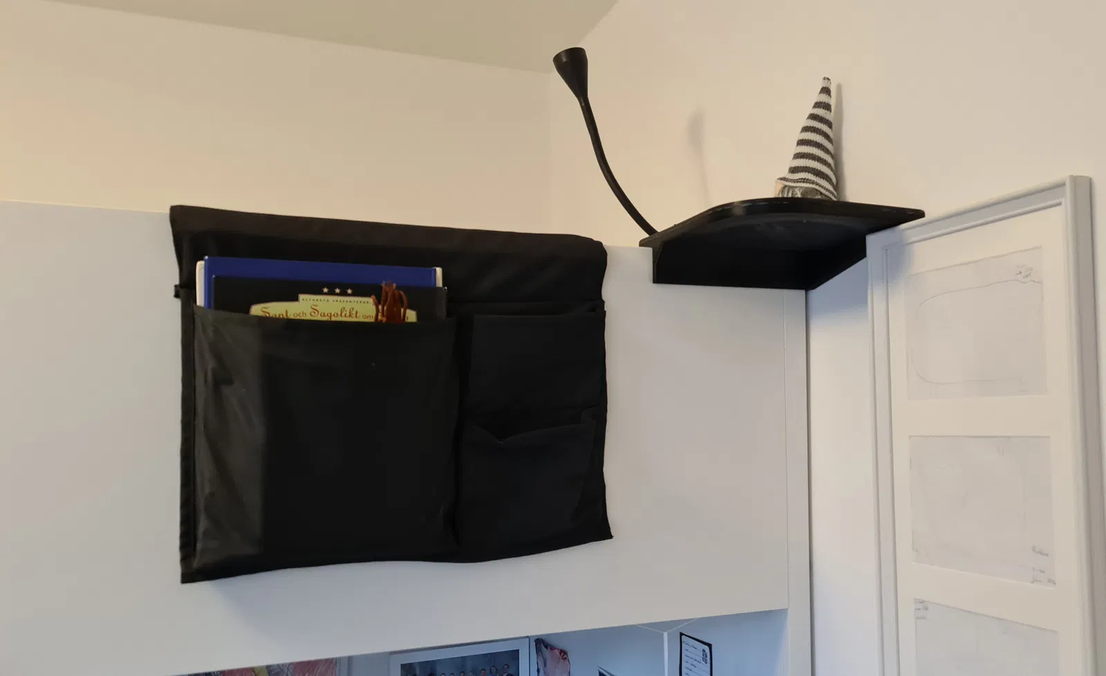 Một cái kệ nhỏ vừa khít, dùng làm bàn đầu giường cho giường tầng Ikea Småstad.