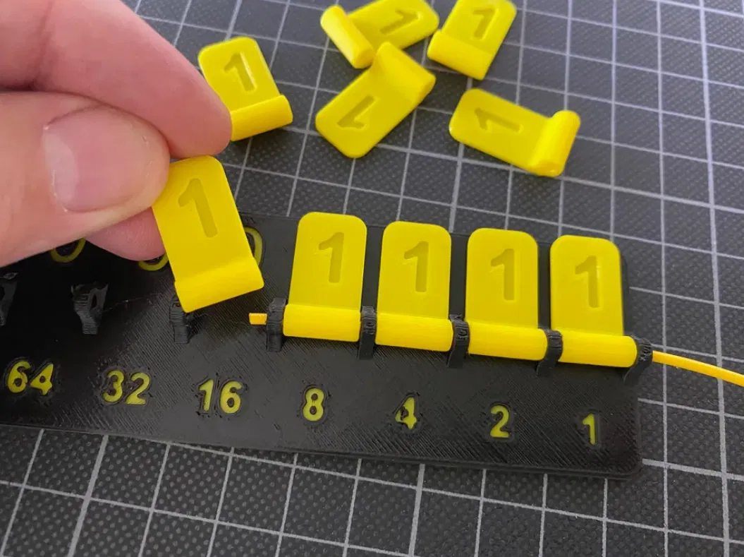 Dụng cụ học giúp bạn luyện đổi mã nhị phân (tối đa 10 bit) sang số thập phân: lật nắp ở hàng trên để chọn bit, rồi cộng các giá trị ở hàng dưới để ra kết quả. Khuyên in đế duo-color, dùng filament làm trục.