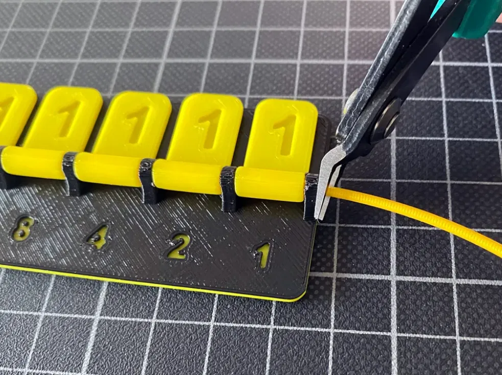 Ghi chú: Chỉ cần dùng một đoạn filament làm trục để giữ các nắp đúng vị trí. Khuyến nghị in phần đế dạng hai màu (duo-color) để dễ đọc hơn như hình minh họa.