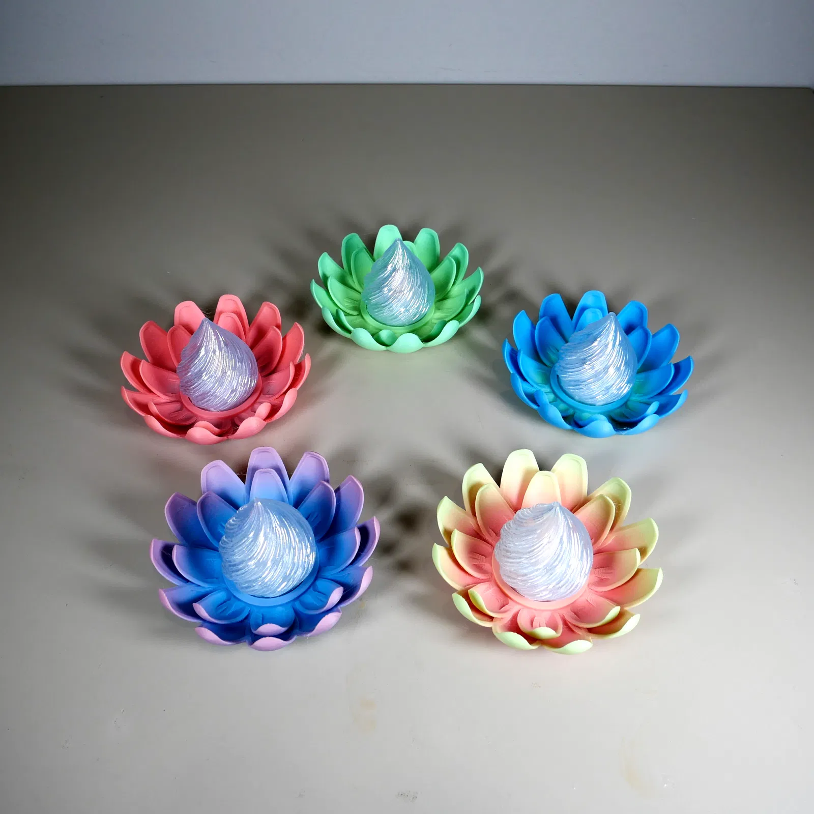 Đế hoa cho nến tealight, rất hợp để trang trí và mừng lễ Diwali. Cả hai chi tiết in không cần supports; phần chụp ngọn lửa in vase mode với zero bottom layers. Hợp cho PLA như Creality Hyper Rainbow.