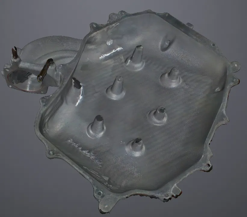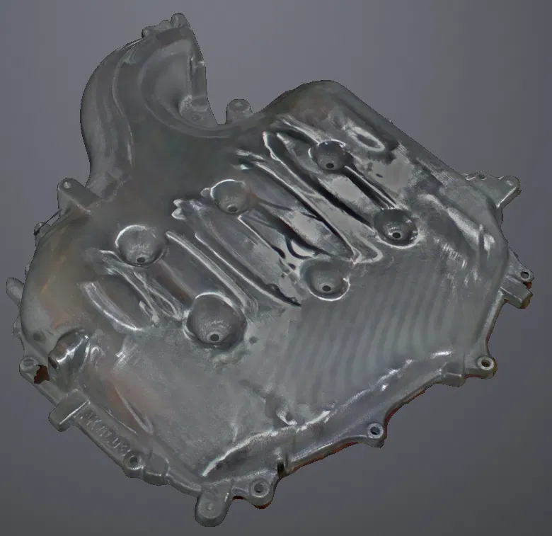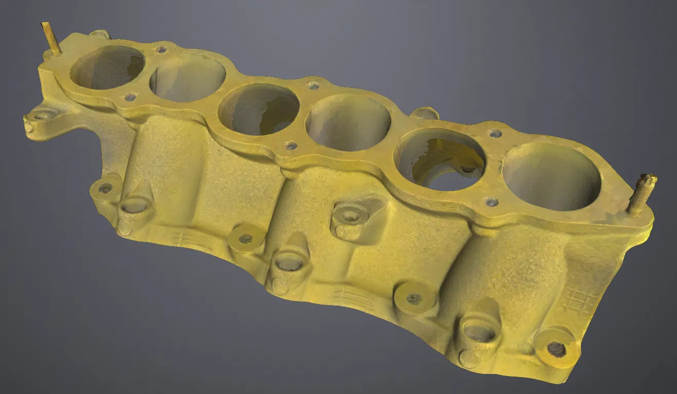 Đây là một mesh được tạo ra từ point cloud quét và chưa được chuẩn bị để in 3D. File này chủ yếu dùng để copy các hình học quan trọng (ví dụ: mặt phẳng, các cổng/ports và vị trí lỗ bắt fastener) nhằm dựng một intake manifold mới, hoặc để fit-check một model trước khi hàn/cắt kim loại.