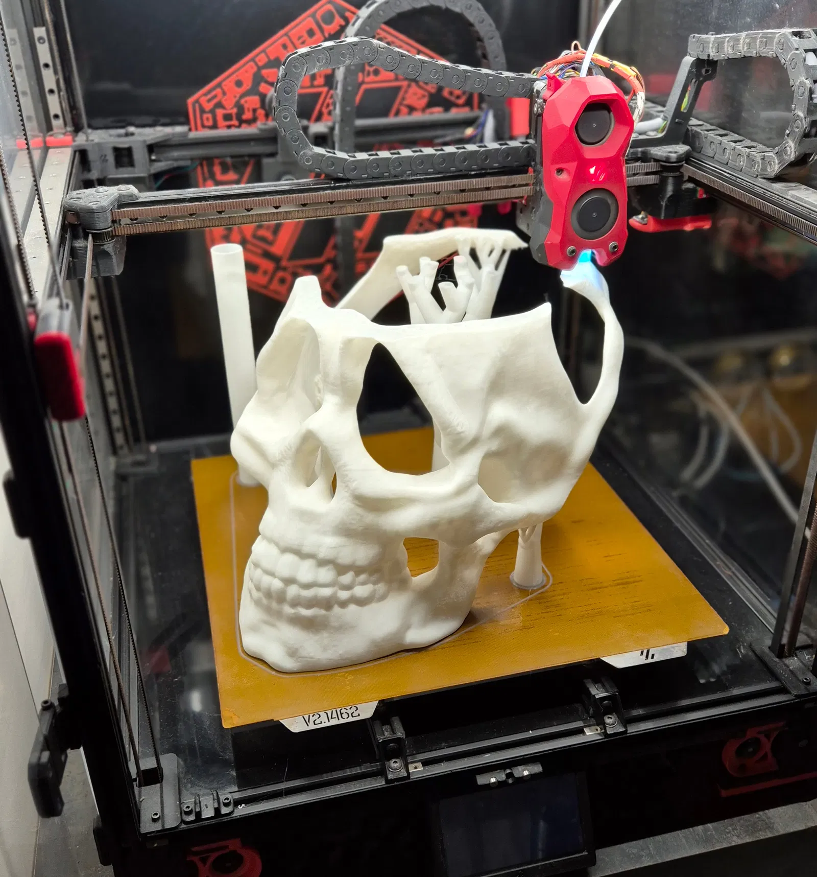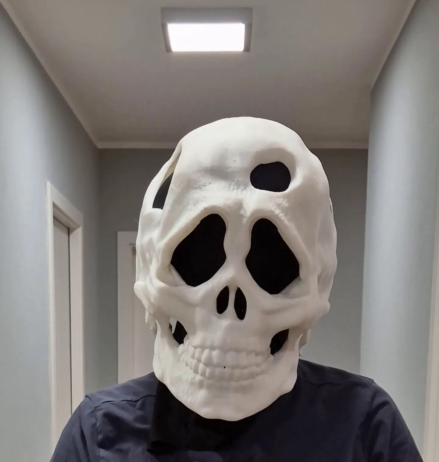 Skull Mask gồm 2 phần trước/sau, ghép lại bằng dây thun (elastic bands) để đeo dễ và chắc hơn. Có chốt canh (alignment pins) và gợi ý lót ống mút cách nhiệt để đeo êm. Phù hợp in FDM.
