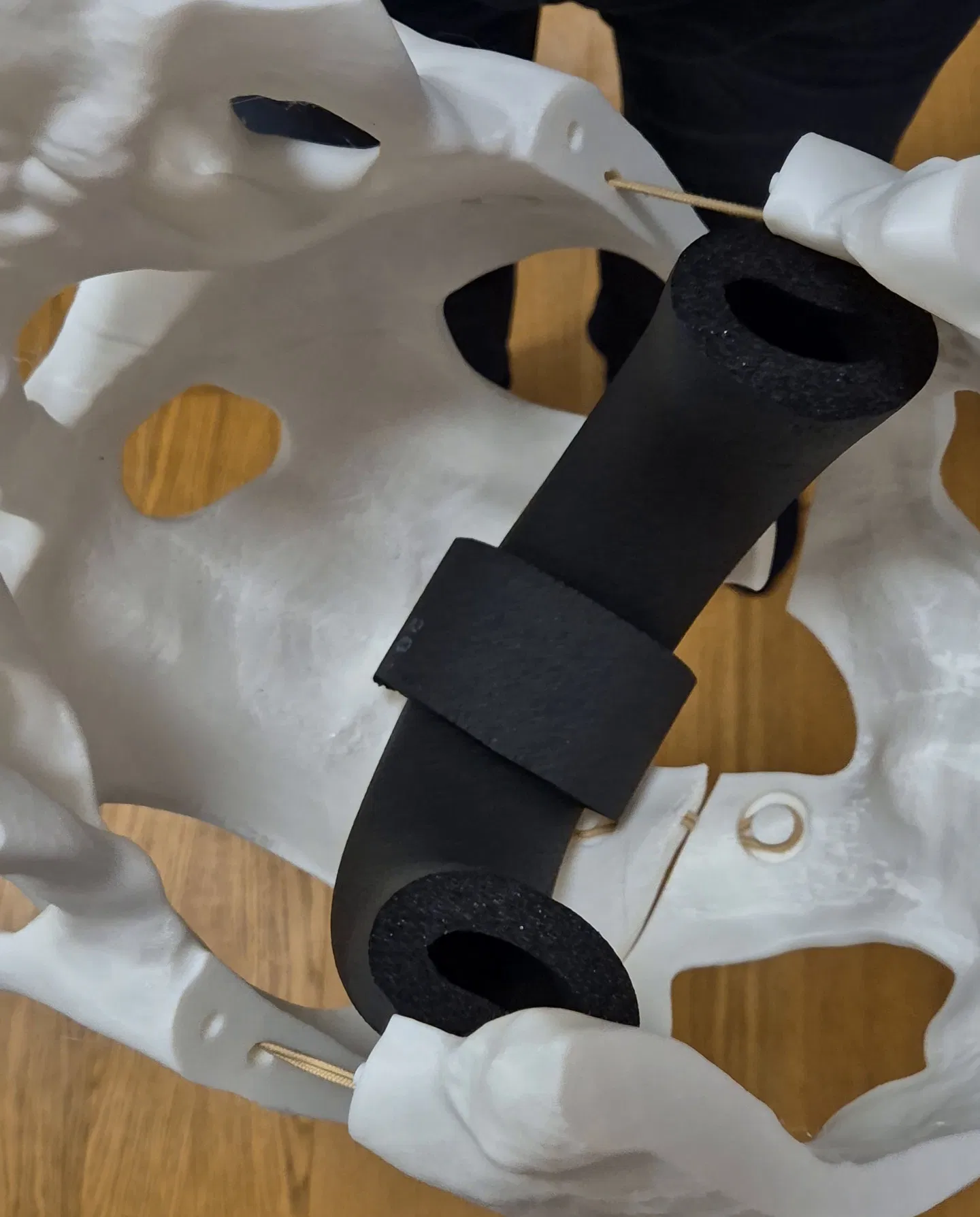 Phần trước và phần sau được nối bằng dây thun, và miếng phía sau có các chốt canh (alignment pins) giúp hai phần khớp chắc với nhau. Dây thun sẽ luồn qua các lỗ đã thiết kế sẵn. Để lót êm, mình dùng ống mút cách nhiệt (insulating foam pipe), dán vào mặt trong của phần trước để đeo thoải mái hơn. Loại ống mút này vốn dùng để bọc cách nhiệt cho ống sưởi hoặc ống nước, có thể dễ dàng mua ở các cửa hàng vật liệu/đồ điện nước.