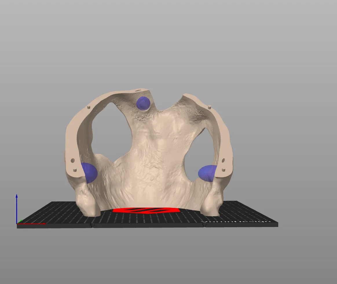 Mình dùng organic supports chỉ ở một số khu vực được đánh dấu màu tím (xem hình), như chỗ gắn dây thun và phần đỉnh đầu lâu ở miếng trước. Mình tắt auto-generated supports để giới hạn support đúng vào các vị trí này.