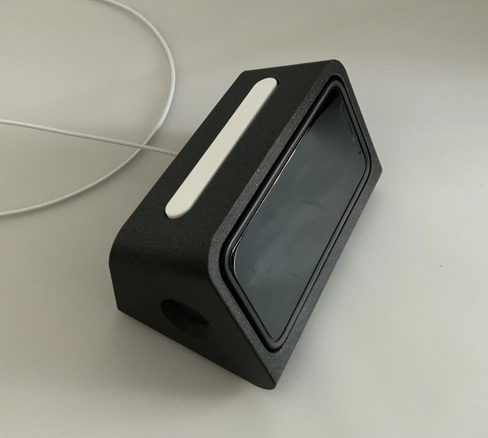 Mẫu dock StandBy dành cho iPhone 12 Mini dùng kèm ốp Quad Lock, tối ưu để vừa sạc Apple MagSafe đường kính 55.90 mm. Clicker dày và nhô hơn, đế ngắn thẳng hơn, có hốc để dán miếng silicone.