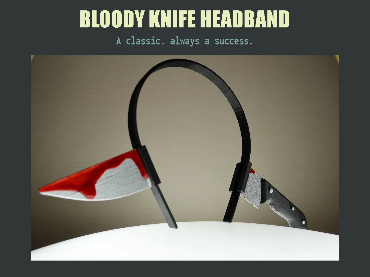 Mẫu Bloody Knife Headband dạng nhiều part để dễ làm multicolor bằng nhiều vật liệu hoặc sơn. Có kèm phần ngàm/attachment STL để bạn remix, thêm phụ kiện hay biến thể cho Halloween, tiệc tùng.