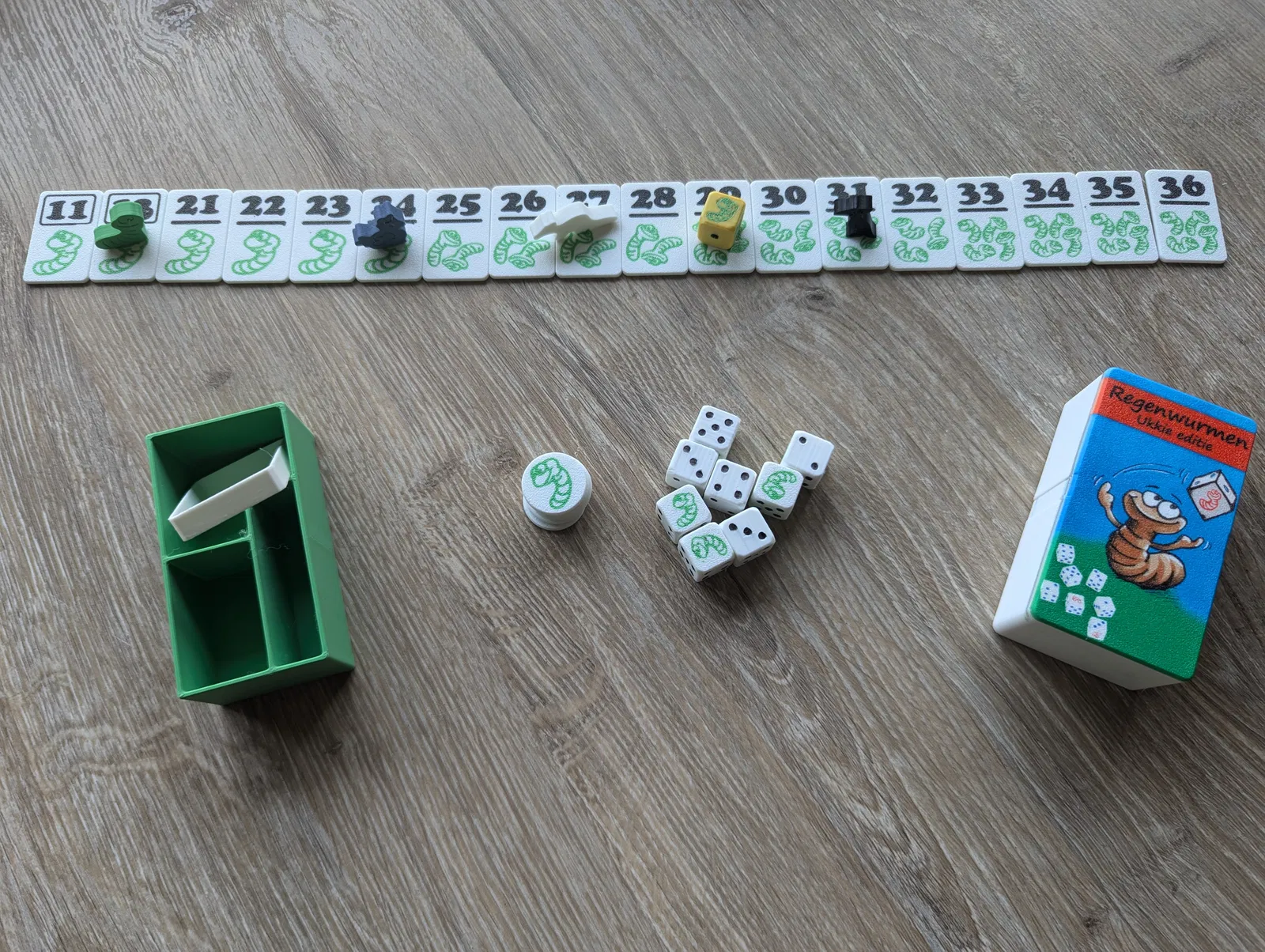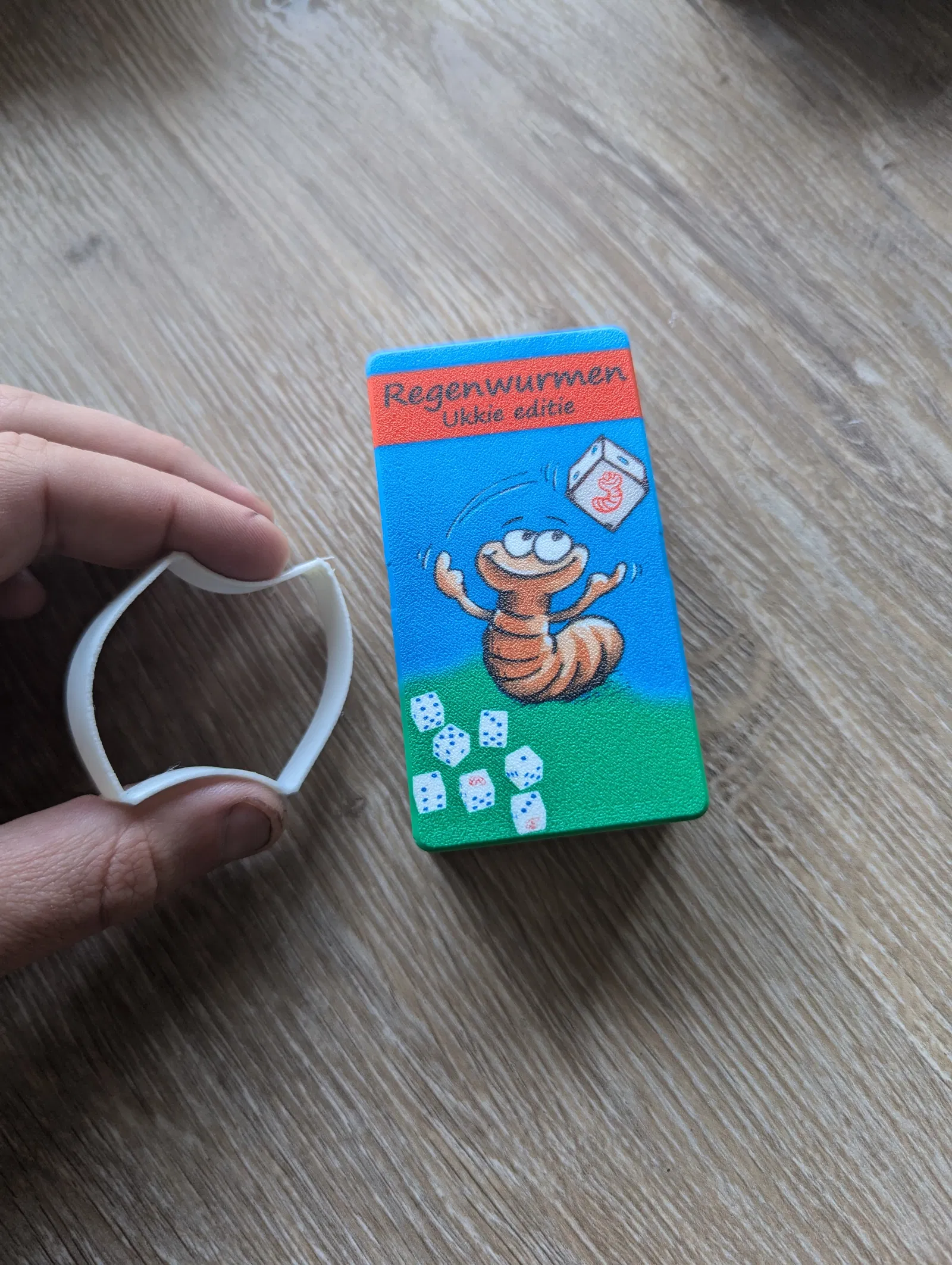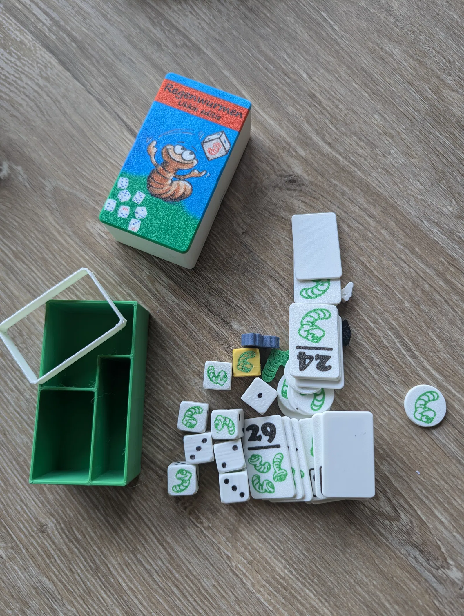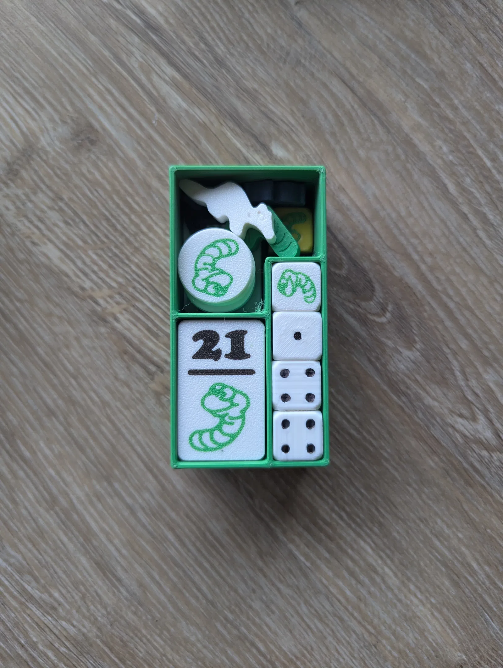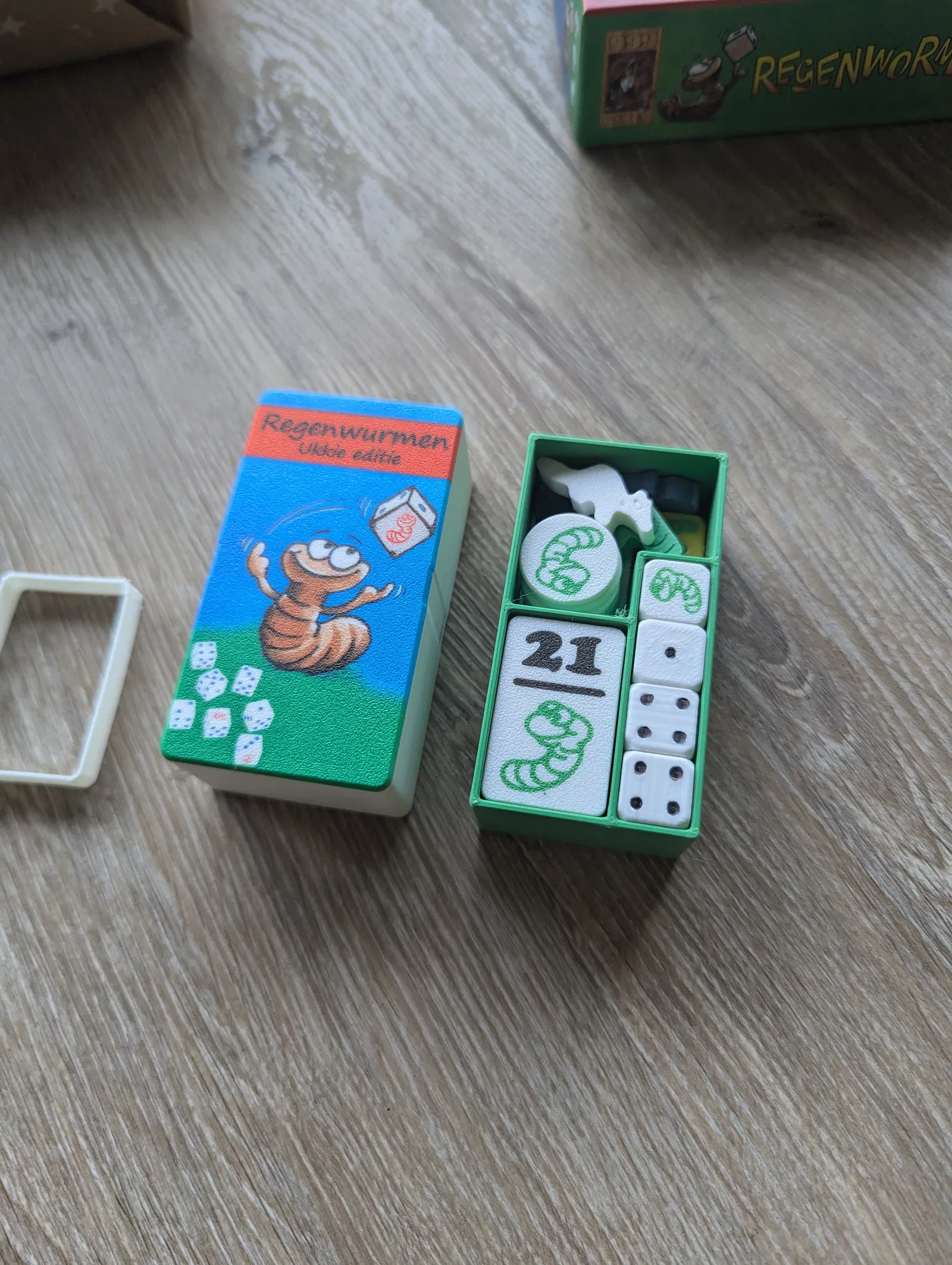 Phiên bản pocket in 3D của Pickomino (Regenwormen/Heckmeck) kèm expansion. In PLA, dây giữ nắp bằng TPU. Tile multicolor lớp đầu; chấm xúc xắc tô marker để tiết kiệm, xúc xắc expansion in multicolor full.