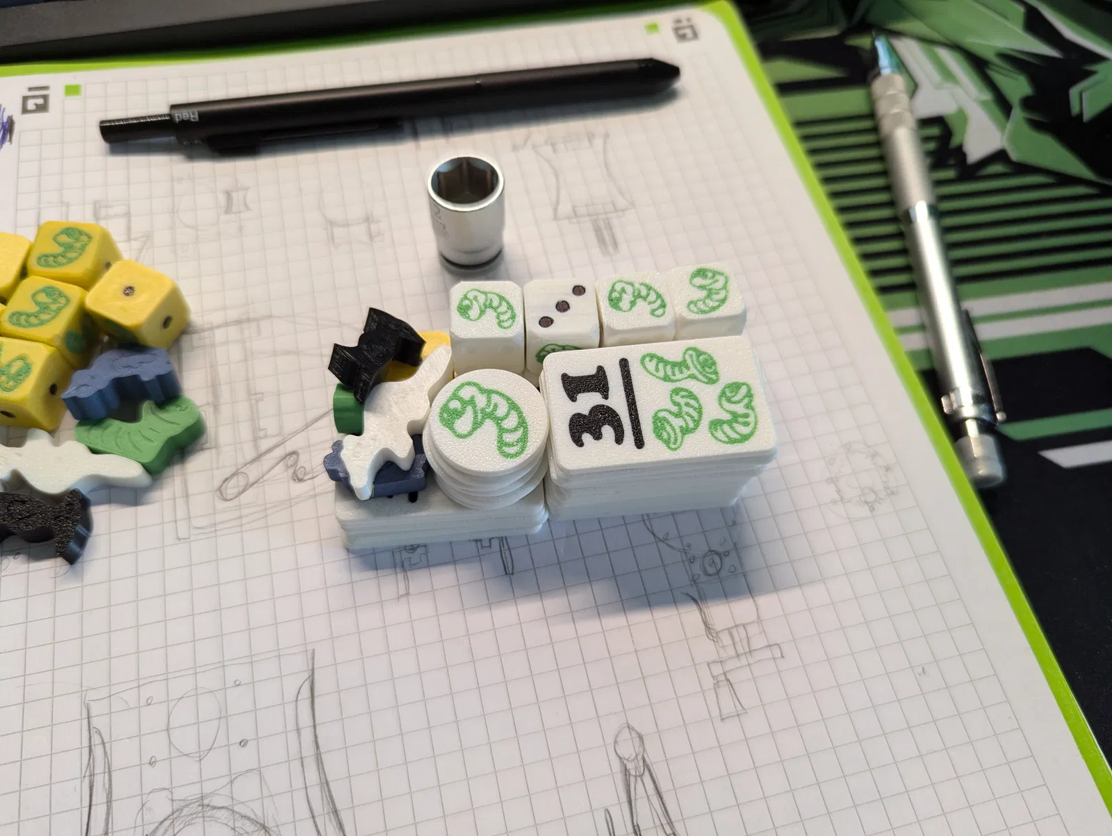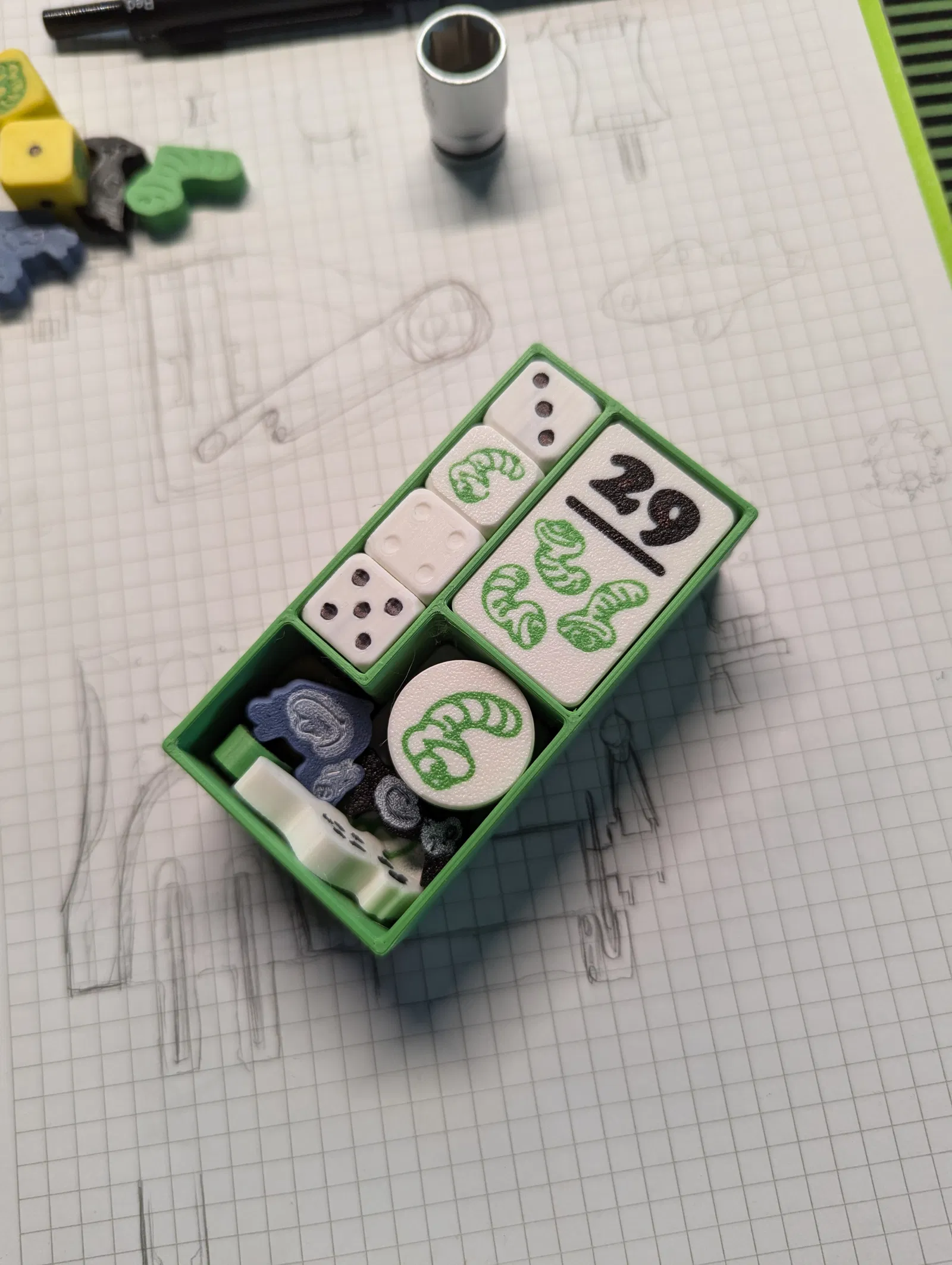 Toàn bộ tile được in multicolor ở lớp đầu tiên. Con sâu trên xúc xắc cũng vậy, nhưng các chấm thì mình tô bằng bút lông permanent marker để tiết kiệm vật liệu và thời gian in. Chỉ riêng xúc xắc expansion là in multicolor đầy đủ.