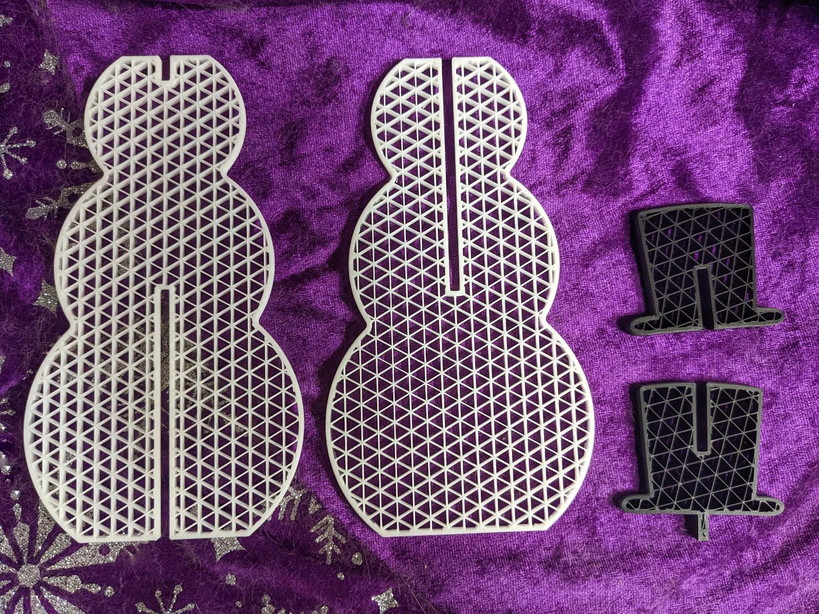 Mẫu người tuyết kiểu flat pack, gồm 4 miếng in rời rồi trượt lắp vào nhau. Có tùy chọn lắp thêm nón; các chi tiết giữ bằng friction fit, có thể dán keo nếu muốn chắc hơn. In không top/bottom để khoe họa tiết infill.
