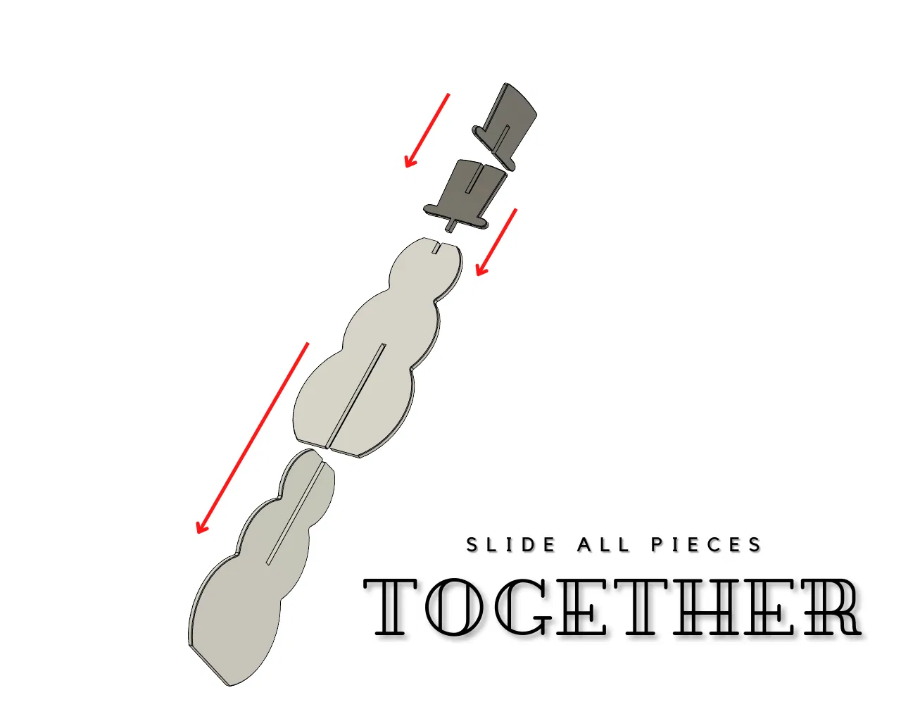 Một chú người tuyết kiểu flat pack, có hoặc không có nón. In 2 miếng thân người tuyết rồi trượt lắp vào nhau. Làm tương tự với 2 miếng của cái nón và gắn lên đầu người tuyết (nếu bạn muốn). Tất cả các miếng được giữ bằng kiểu lắp ma sát (friction fit), nhưng bạn có thể thêm keo để chắc chắn hơn.