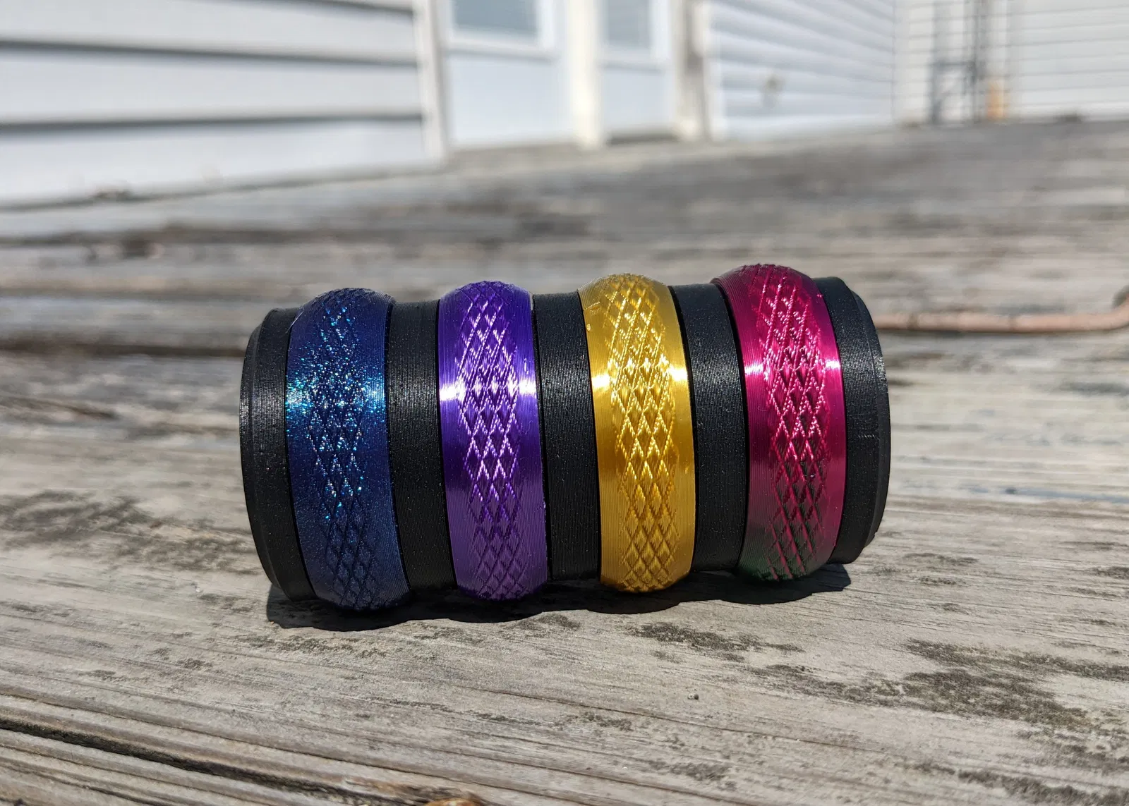 Đồ chơi fidget dạng spinner có thể mở rộng: in Top/Bottom và 1 spinner là dùng được, muốn dài thêm thì thêm Spacer và spinner cho từng đoạn. Khi quay có tiếng click vui tai nhờ lò xo in sẵn, không cần support.