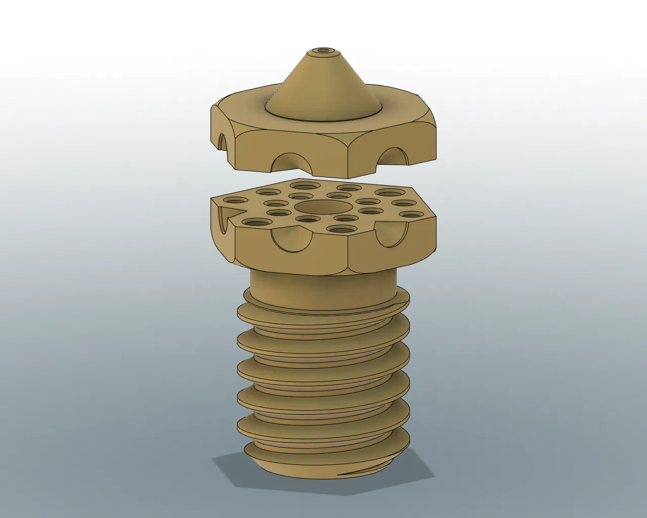 Nozzle có Guides - Các gờ dẫn hướng nhỏ in 3D được in rời và dán vào thân chính. Đầu nozzle chỉ cần đặt tựa lên phần thân nozzle chính.