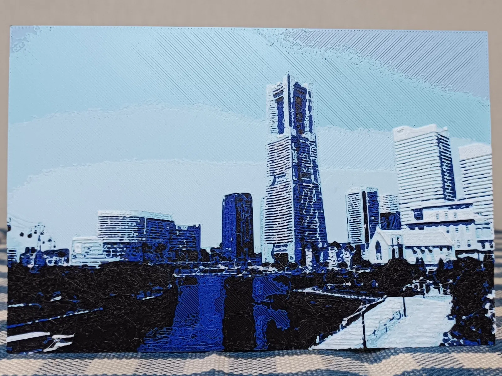 Mẫu Yokohama HueForge tái hiện phong cảnh Yokohama bằng HueForge. Hướng dẫn in kèm thông số 100% infill, layer height 0.08mm và lịch đổi filament theo từng layer để ra đúng chuyển sắc.