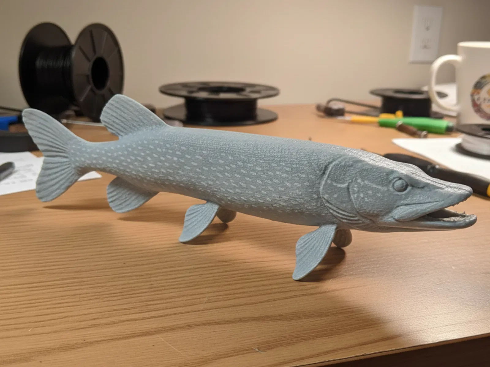 Tượng cá Northern Pike dạng standalone với thân dài thon gọn, vây đặt tự nhiên và texture vảy rõ. Không kèm base, phù hợp trưng bàn, sưu tầm hobby hay decor chủ đề cá nước ngọt; in đẹp với matte PLA, thấy nhẹ layer FDM.