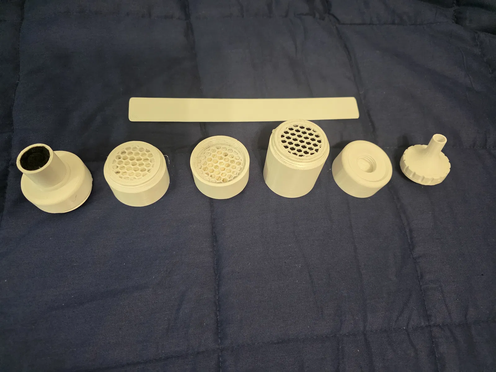 Hãy dùng một trong các cái screen ở mỗi bên của từng section để giữ vật liệu lọc. Chúng được thiết kế dạng snap fit và sẽ khá chặt. Để in screen cho ra đúng, dùng Object specific settings cho Top/Bottom Screens (3 cái) và đặt 4 walls, 0 Top/Bott layers, Honeycomb Infill 20%. Nhìn như một đồng xu đặc nhưng khi slice sẽ ra dạng lưới. Chỉ cần nhớ đừng áp dụng cài này cho tất cả model, chỉ cho phần screens thôi. Các phần còn lại in theo cài đặt tiêu chuẩn với 8x Walls/Top/Bottom Layers (mình từng bị vấn đề kín khí; cài tiêu chuẩn có thể hợp với bạn, hoặc drip tip có thể bị rò ở đoạn cong), và supports là ổn. Dung sai là 0.2mm cho FDM. Đây là… lần chỉnh thứ ba hoặc thứ tư rồi. Mình nghĩ bản này là “chốt” được, với mình thì nó kín ok ngay như hiện tại.