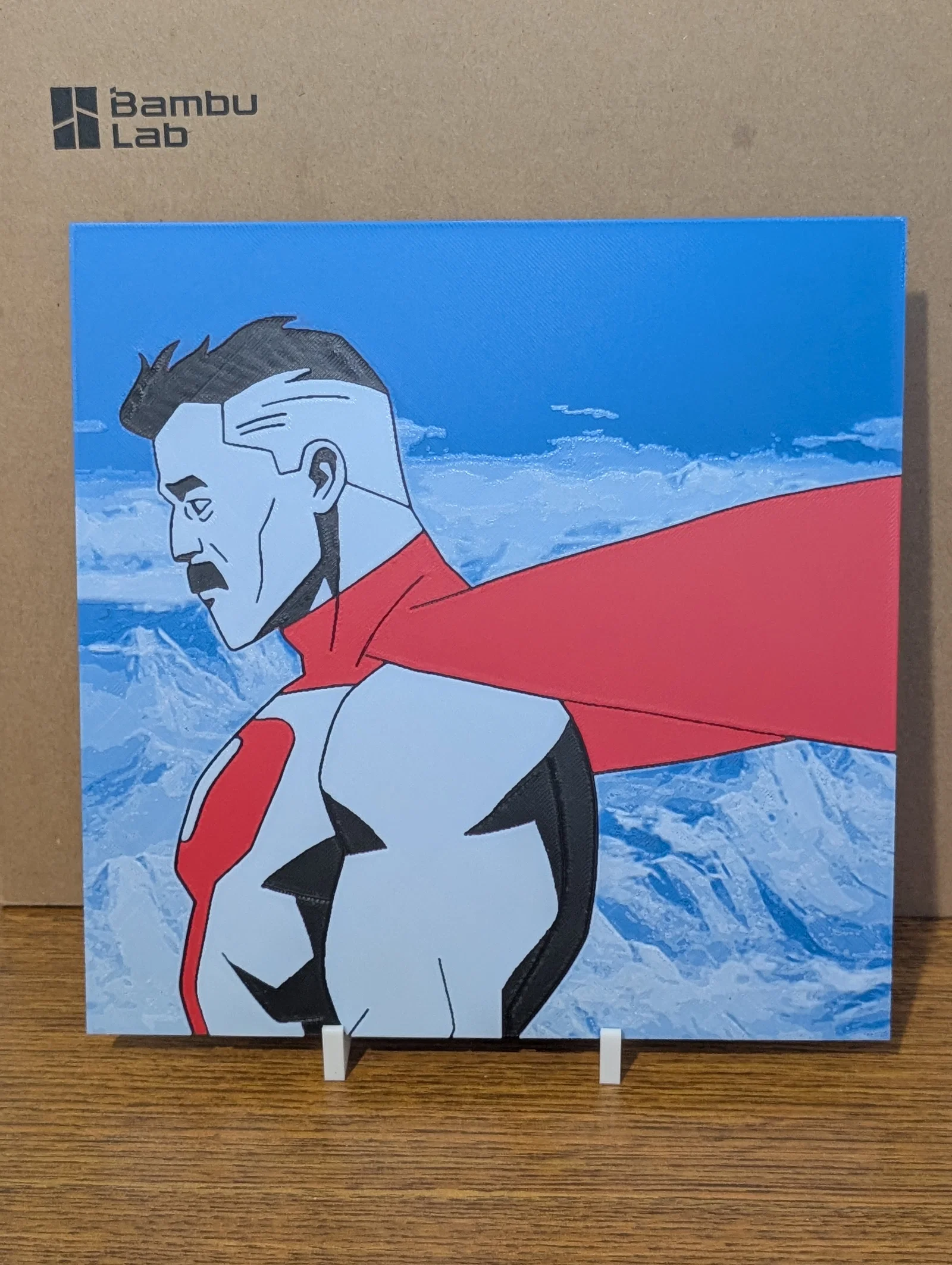 Mẫu Hueforge Omni-Man trong Invincible, dựng theo một khung hình (screenshot) từ phim. Kích thước 200x200mm, in 100% infill; có hướng dẫn layer height, độ dày và lịch đổi màu (filament swap) cho 4 cuộn PLA.