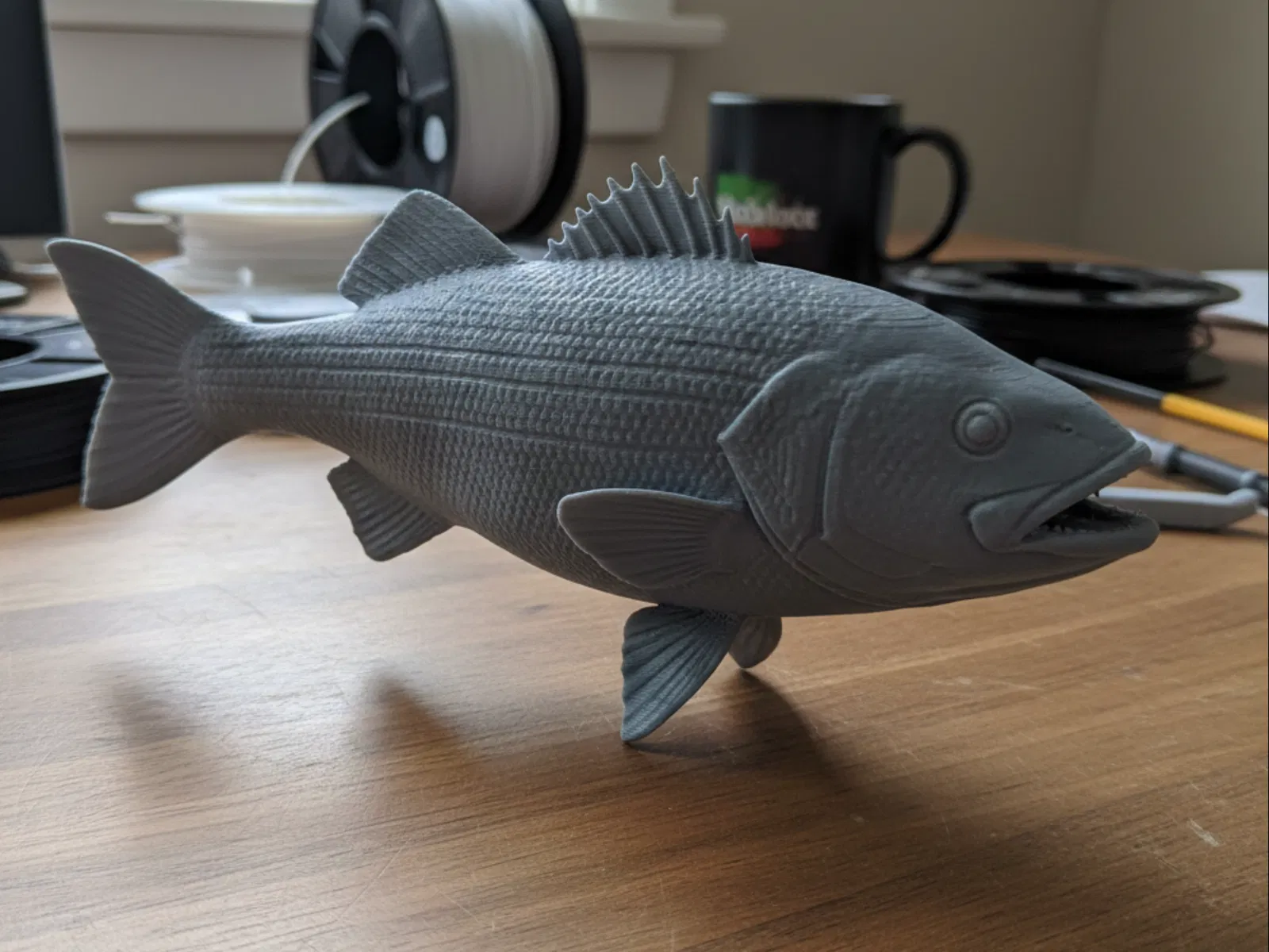 Tượng cá Striped Bass dạng standalone với chi tiết giải phẫu chuẩn, vảy texture rõ và vây uốn lượn. Không kèm đế nên trưng gọn trên bàn/kệ. In PLA matte, thấy nhẹ đường layer FDM cho vẻ “home-printed” chân thật.