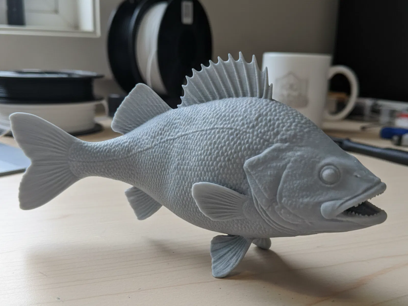 Tượng cá Yellow Perch dạng standalone này có giải phẫu chân thực với vảy có texture, vây được làm chi tiết và thân uốn cong nhìn rất sống động. Không kèm base, nên cực hợp để trưng bày hobby, decor bàn làm việc, hoặc bổ sung vào bộ sưu tập cá nước ngọt. In sạch đẹp với matte PLA, có thấy nhẹ các đường layer FDM để giữ đúng chất chi tiết 3D printed. Rất hợp cho dân câu cá hoặc người mê cá.