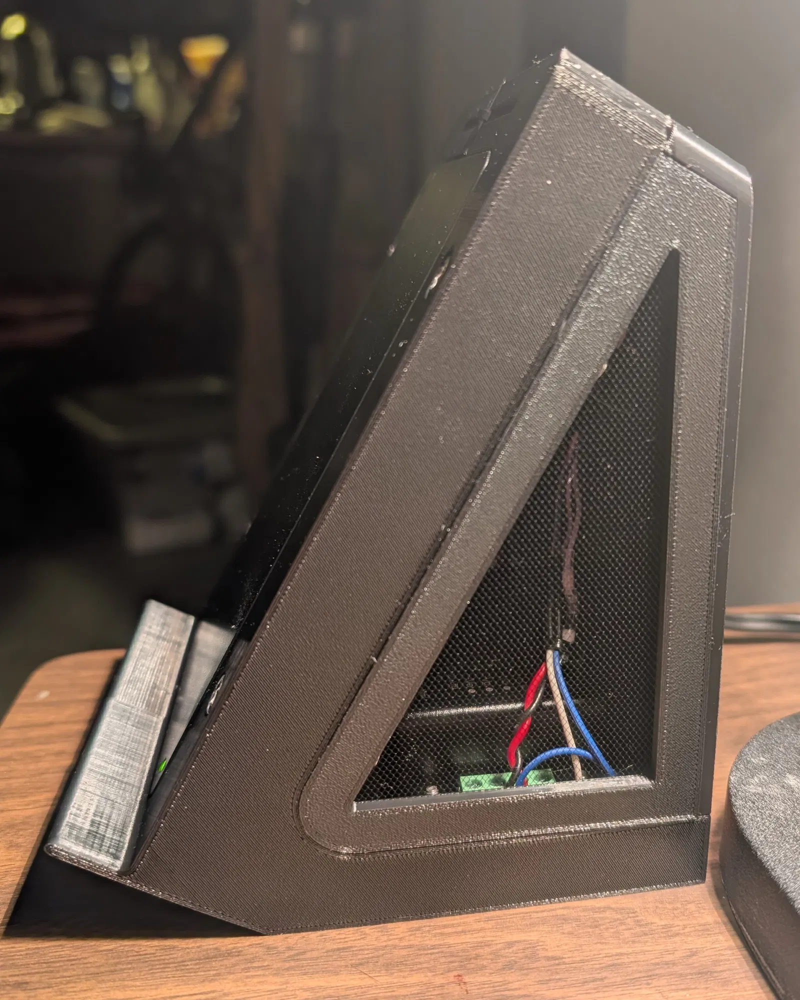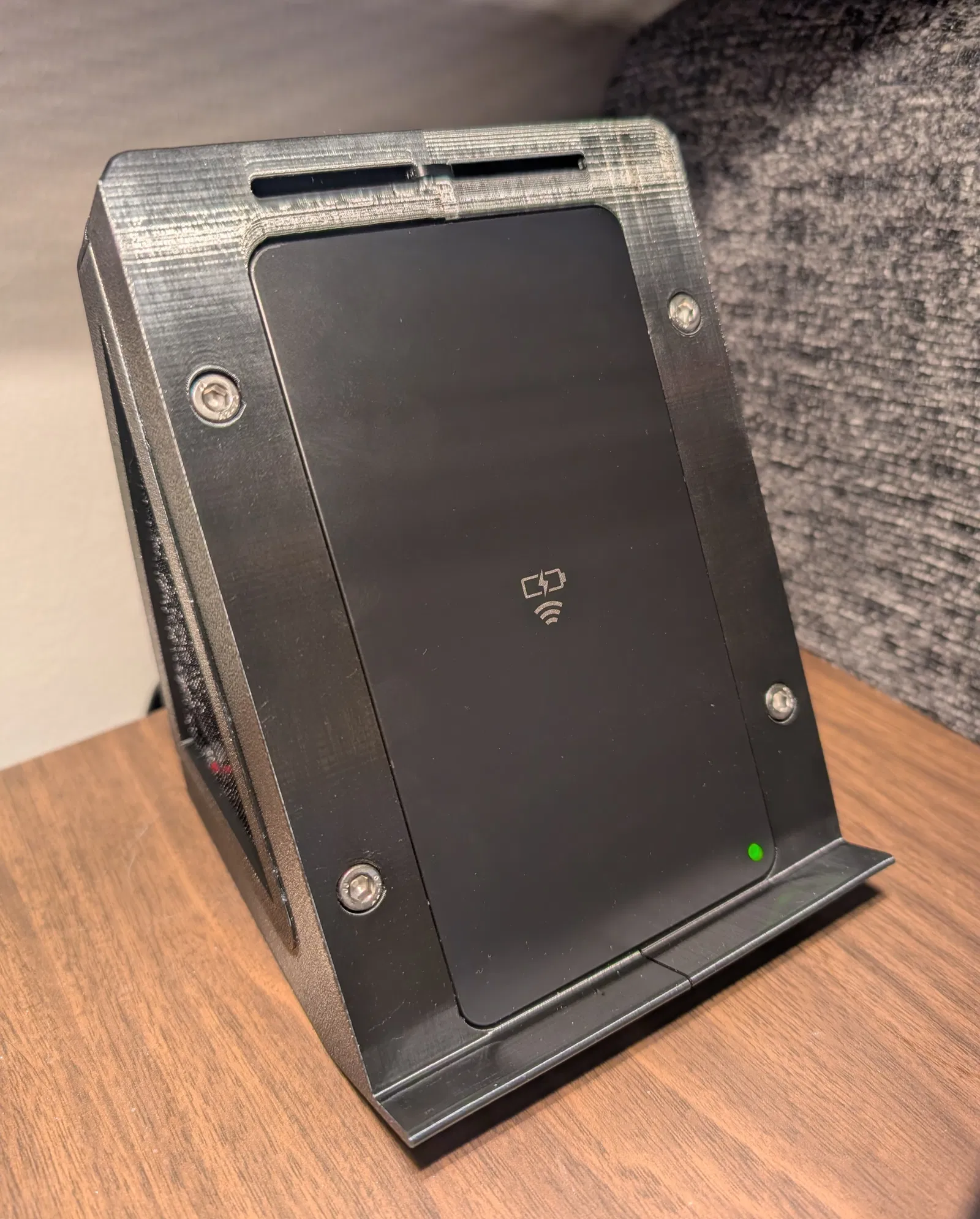 Vỏ sạc không dây để bàn dùng Wireless Charging Module từ Toyota. Thiết kế này thật ra không thực dụng lắm, nhưng biết đâu có ai dùng được hoặc remix lại model. Bạn có thể chọn in vỏ theo dạng 2 nửa hoặc in nguyên khối 1 phần. Hai tấm hông dùng vải tulle được kẹp giữ bên trong để làm lưới che.