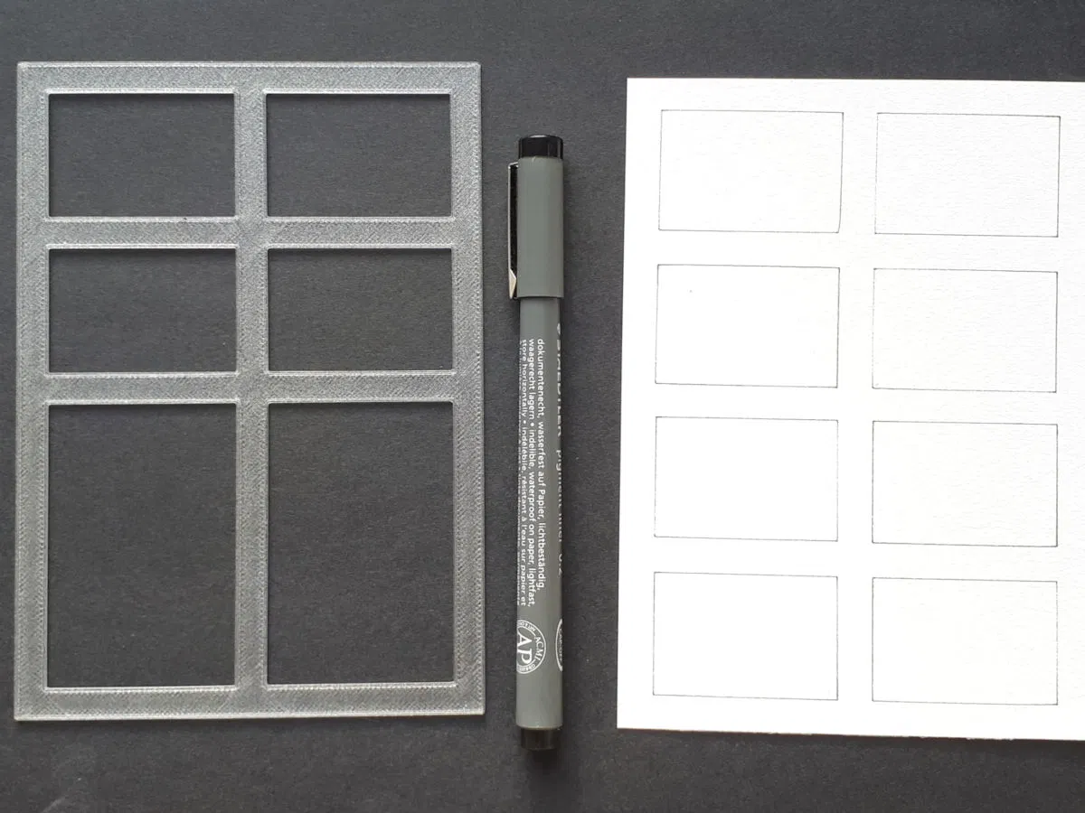 Bộ template giúp kẻ nhanh các khung hình chữ nhật đều nhau cho miniatures trên giấy A6 (8/6/4 khung). Có kèm file thiết kế để tùy biến cho khổ giấy hoặc bố cục khác. In PETG, PLA cũng dùng được.