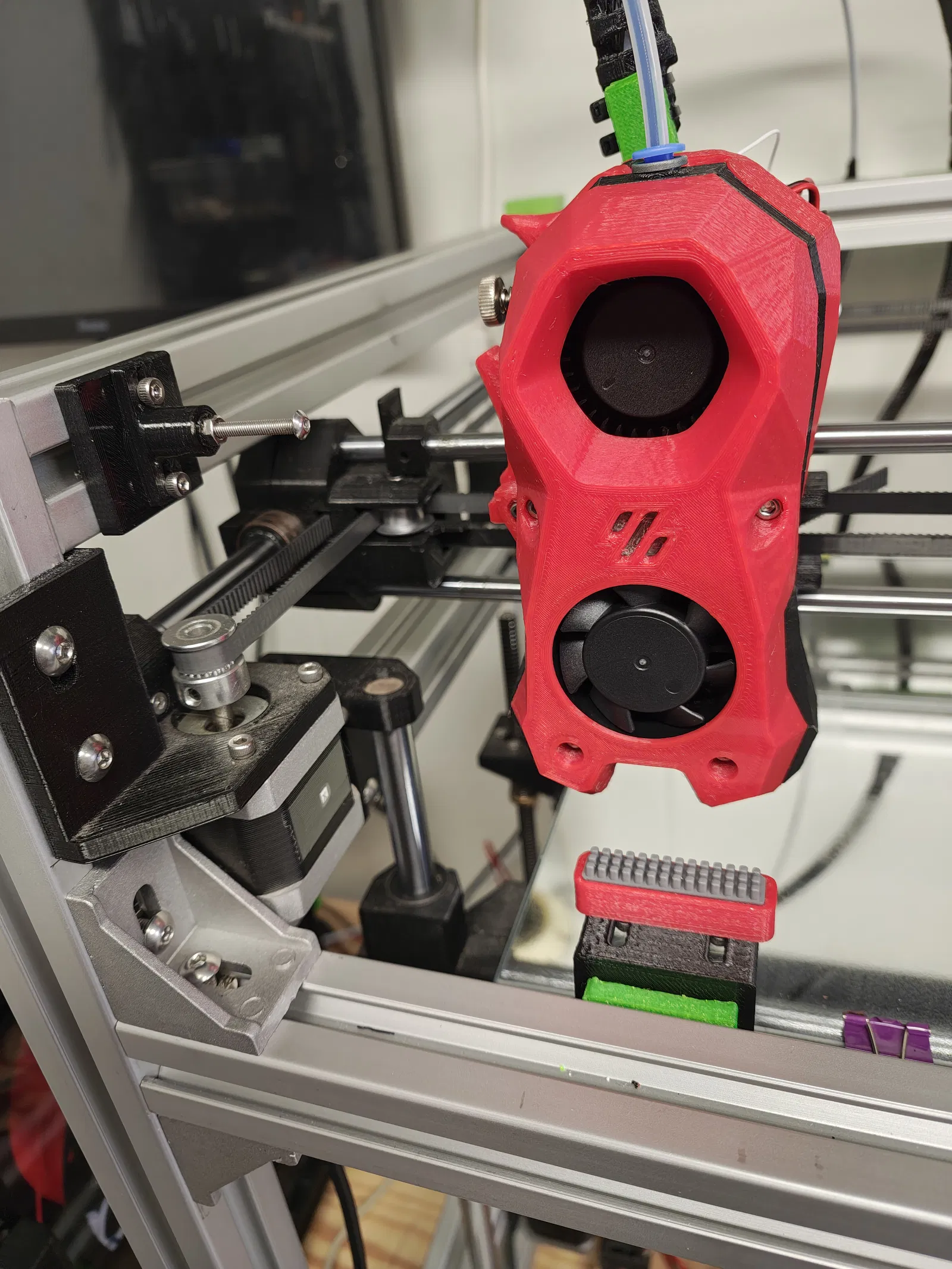 Mình dùng món này trên máy HEVO với hotend StealthBurner. Mình hạ thanh nhôm định hình 3030 phía trước-trên xuống để gắn cái brush và chừa thêm không gian hành trình cho StealthBurner. Model được in theo từng phần, không cần support. Cần 4 heat inserts cho ốc SHCS 3x6mm.