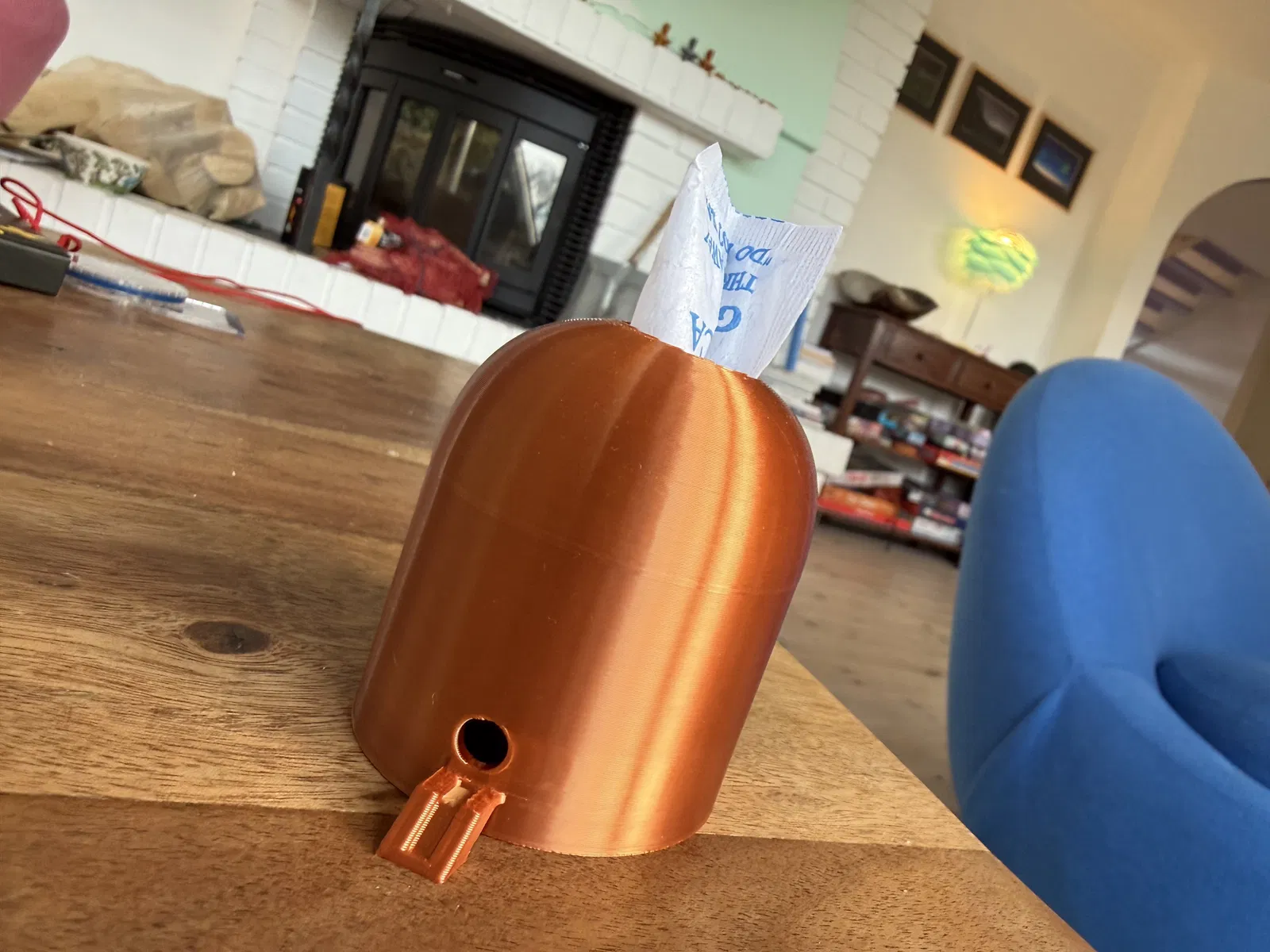 Mẫu này lấy cảm hứng từ một sản phẩm của Thụy Điển tên Torrbollen, dùng silica để hút ẩm trong xe hơi, v.v. Nếu bạn muốn giảm nguy cơ xe bị mốc, hãy in mẫu này và nhét các gói silica gel (gói hút ẩm) vào lỗ ở phía trên.