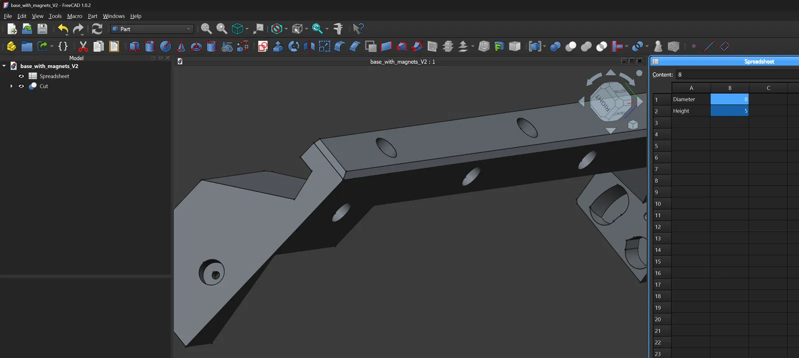 Với các file FreeCAD dạng parametric đi kèm, mình khuyên bạn đừng đặt kích thước nam châm tròn nhỏ hơn 6 x 3 mm hoặc 5 x 4 mm, và cũng đừng lớn hơn 10 x 6 mm. Bạn có thể chỉnh kích thước trong FreeCAD ở mục "Spreadsheet".
