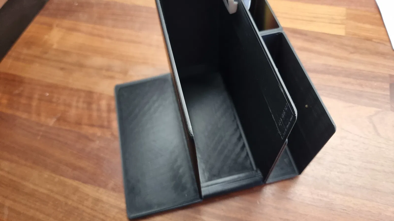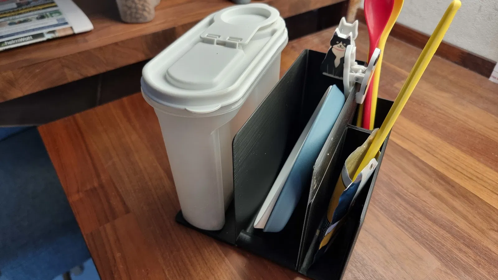Mục đích ban đầu chỉ là cần một chỗ giữ cái bao thức ăn đang mở, để sẵn muỗng bên trong vì nó hay bị ngã/đổ qua một bên. Phần trống ở giữa thì làm như một ngăn để dĩa sạch. Bên trái chủ yếu là để tăng độ ổn định. Cuối cùng là còn dư chỗ ở bên phải nên mình làm thêm một chỗ gác/để muỗng.