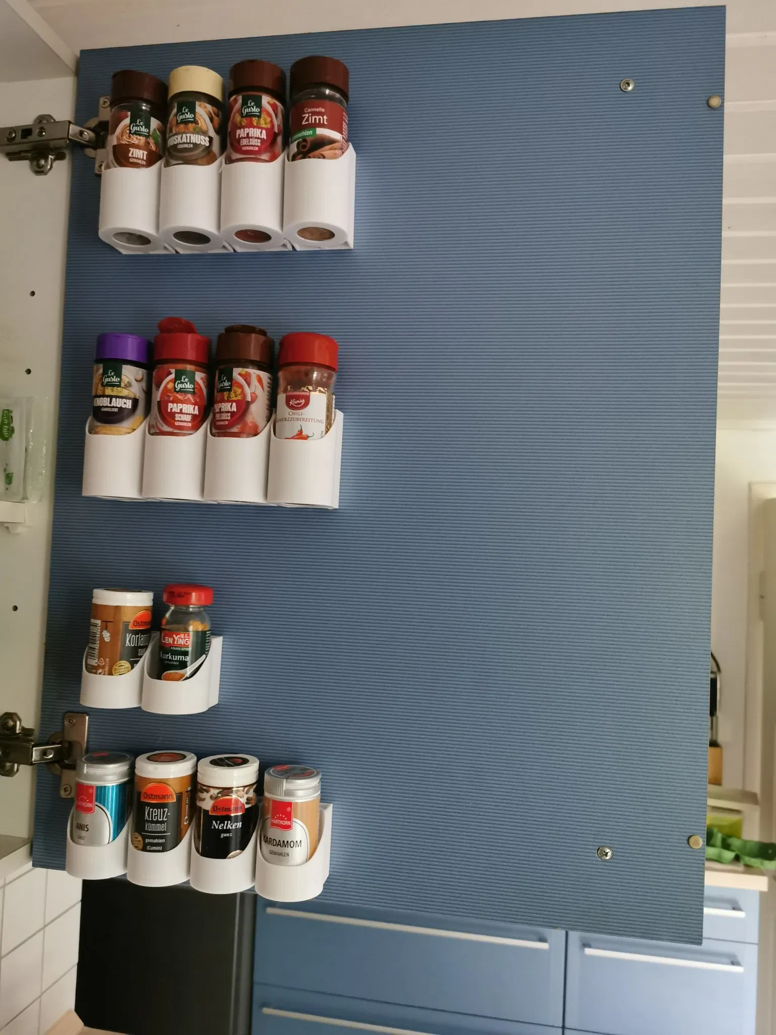 Dieser Wand-Gewürzhalter bietet eine praktische und platzsparende Lösung, um deine Gewürzsammlung zu organisieren. Das Design ist für die typische Größe der Ostmann-Glasgewürzgläser optimiert und kann einfach an einer Wand oder der Innenseite einer Schranktür befestigt werden.