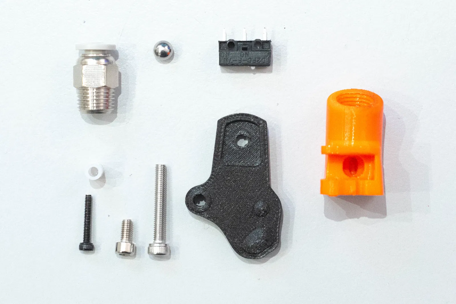 Một mẫu runout sensor cơ bản dành cho extruder HGX-Lite, dùng microswitch Omron D2F và ống Bowden/PTFE. Danh sách phần cứng gồm vít M2/M3, heat-set insert M3, adapter 8 mm và đoạn ống Bowden 6–7 mm.