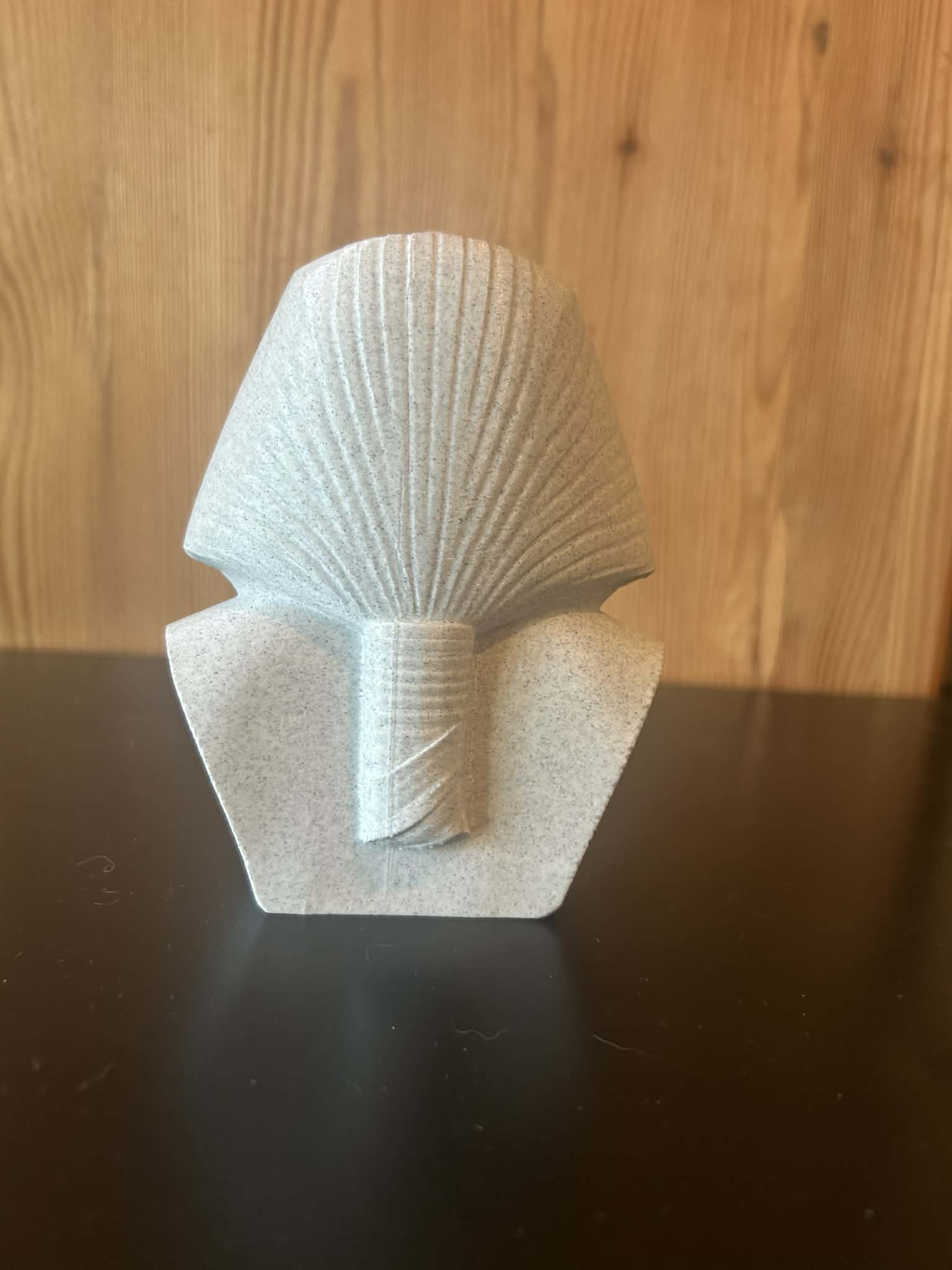 Bản bust này khắc họa Ramesses II theo một diễn giải điêu khắc trung thành, giới hạn ở phần đầu và phần thân trên, đặt trên một bệ đỡ gọn gàng, kín đáo. Khối hình được nhấn mạnh có chủ ý: gương mặt rộng, ánh nhìn thẳng, quai hàm rõ nét và kiểu mũ đội hoàng gia đặc trưng thể hiện uy quyền và sức mạnh gắn liền với vị pharaon. Các đường nét sắc gọn và được khắc sâu để tái hiện thẩm mỹ hoành tráng của tượng Ai Cập cổ đại.