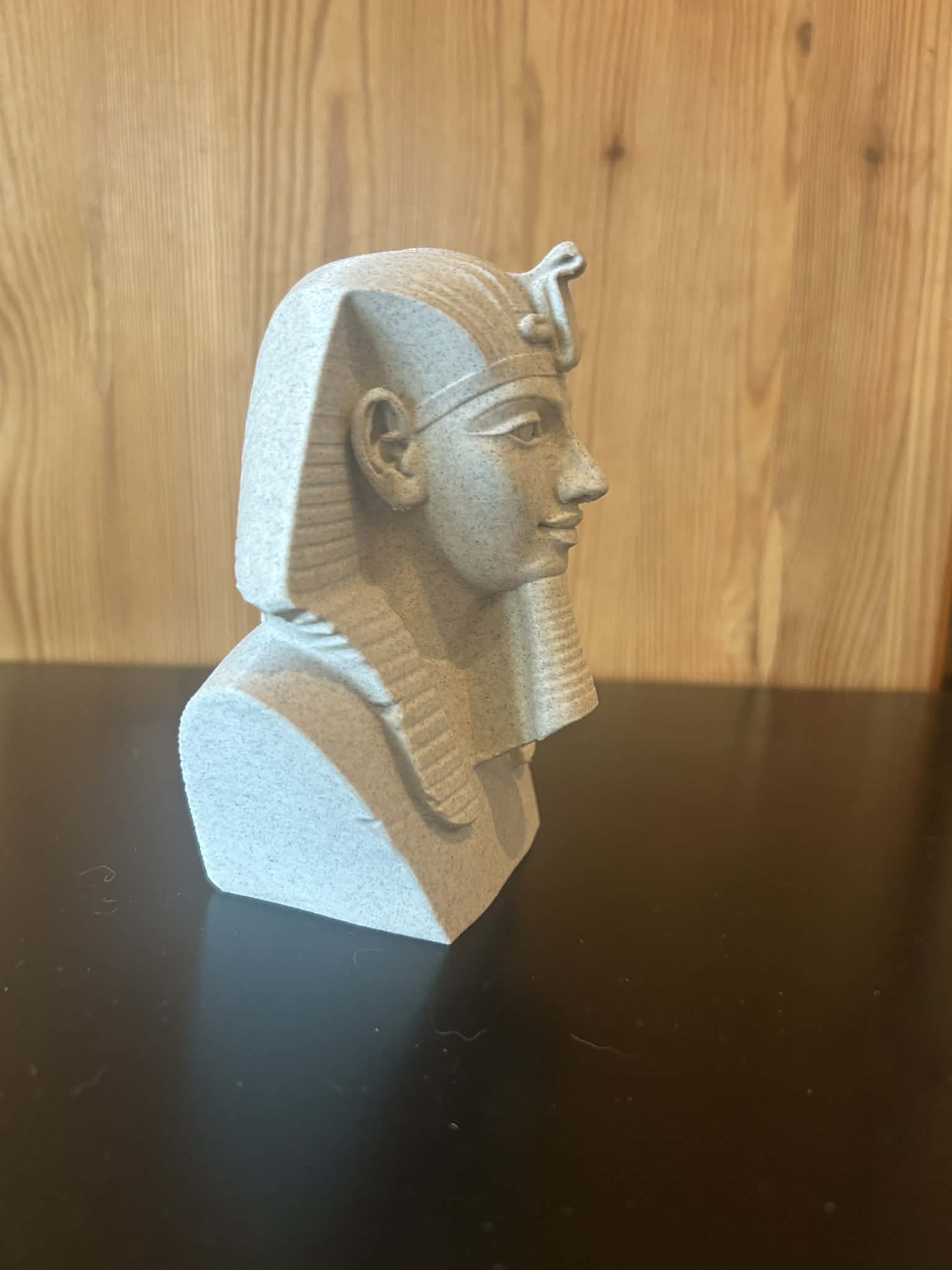 Bản bust này khắc họa Ramsès II theo một diễn giải điêu khắc trung thành, giới hạn ở phần đầu và phần thân trên, đặt trên một bệ đỡ gọn gàng, kín đáo. Khối hình được nhấn mạnh có chủ ý: gương mặt rộng, ánh nhìn thẳng, quai hàm rõ nét và kiểu mũ đội hoàng gia đặc trưng thể hiện uy quyền và sức mạnh gắn liền với vị pharaon. Các đường nét sắc gọn và được khắc sâu để tái hiện thẩm mỹ hoành tráng của tượng Ai Cập cổ đại.