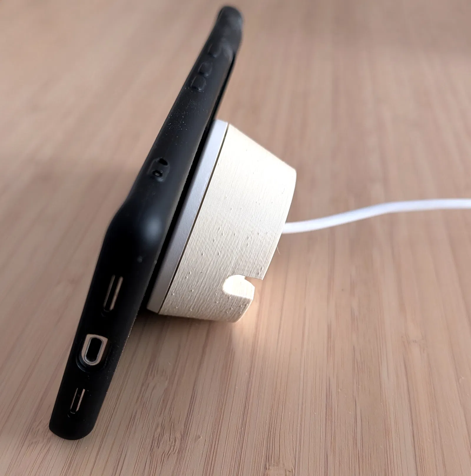 Adapter đơn giản cho Ikea Vastmarke để biến nó thành bộ sạc đầu giường. Gỡ lớp cork và keo cũ, lắp vào adapter rồi dán nhẹ bằng silicone để điện thoại không bị chúi ra trước, vừa sạc vừa làm đồng hồ.