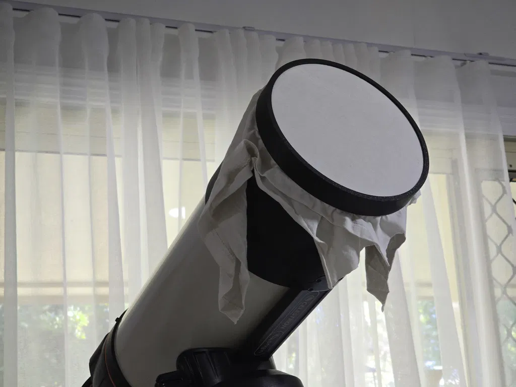 Bộ tạo tham số OpenSCAD in 2 vòng press-fit để kẹp áo thun trắng làm diffuser, dùng như flat field generator. Thiết kế vừa Celestron Origin, có thể chỉnh để hợp nhiều kính khác bằng file OpenSCAD.