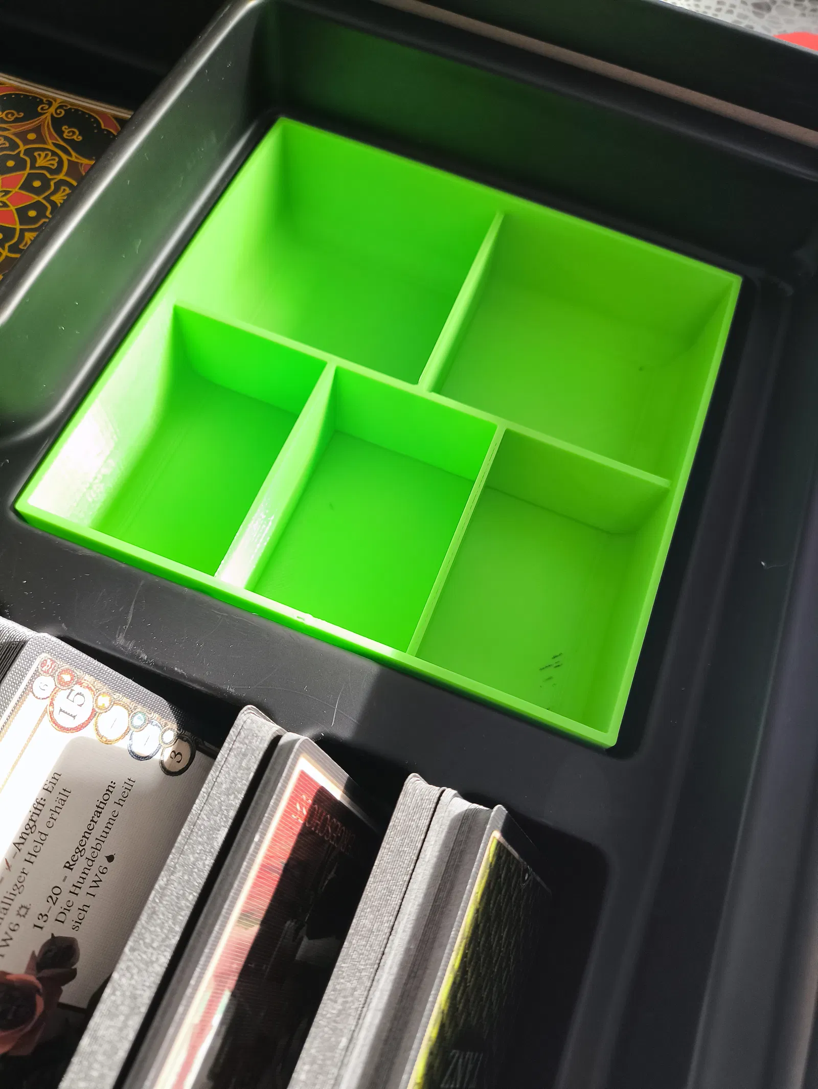 Lấy đồ nhanh: Mỗi ngăn đều có cạnh đáy bo tròn (Fillets), nên các món nhỏ như điểm định mệnh, marker hay biểu tượng sinh lực bằng gỗ có thể đẩy ra bằng ngón tay cho tiện.
