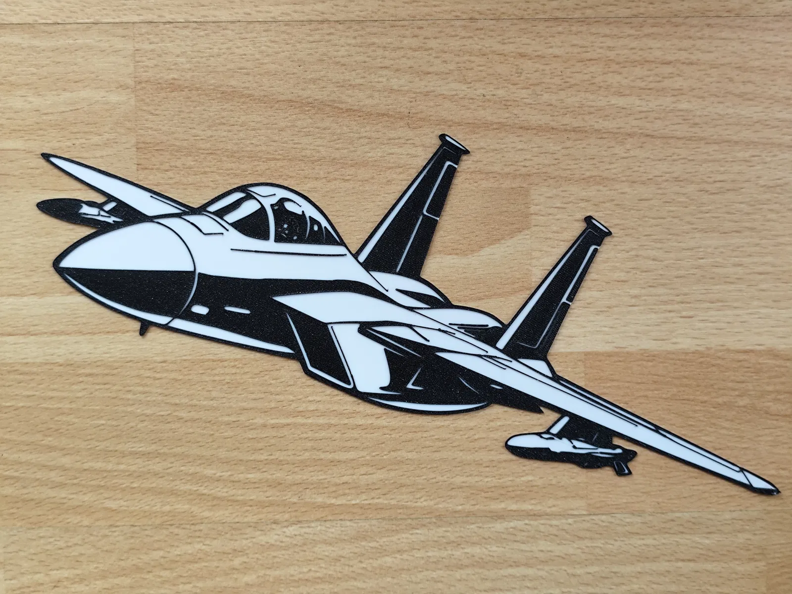 Mẫu wall art F-15 Eagle dạng phẳng, tối ưu in 3D không cần supports. In multicolor bằng cách đổi filament đúng mốc layer height. Hợp treo tường cho xưởng, văn phòng, phòng gaming và người mê hàng không/quân sự.