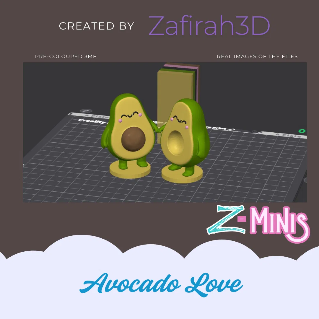 Mẫu Avocado Love Z-Mini miễn phí, có file STL và 3MF pre-colored. Một vài chi tiết cần tô tay để đẹp hơn. Ảnh bìa là AI render chỉ để tham khảo ý tưởng sơn, không phải preview của 3MF.