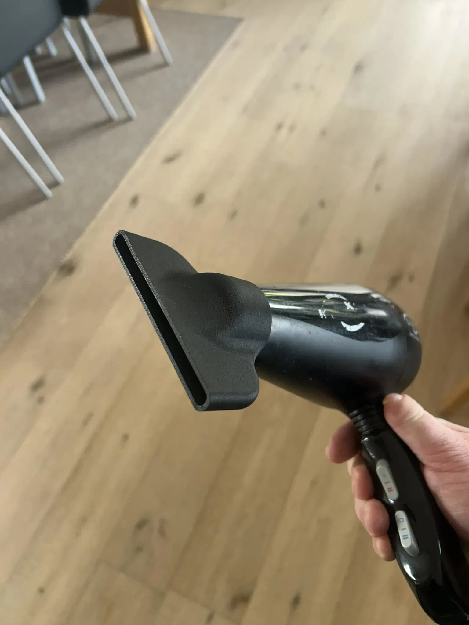 Đầu sấy tập trung bản rộng thay thế cho phụ kiện máy sấy Ø42.5 mm bị hỏng. Thiết kế chuyển từ cửa tròn sang khe dẹt 100×6.5 mm giúp luồng gió rộng, đều, giảm nhiễu loạn; khuyến nghị in PETG/ASA/ABS/PETG-CF.