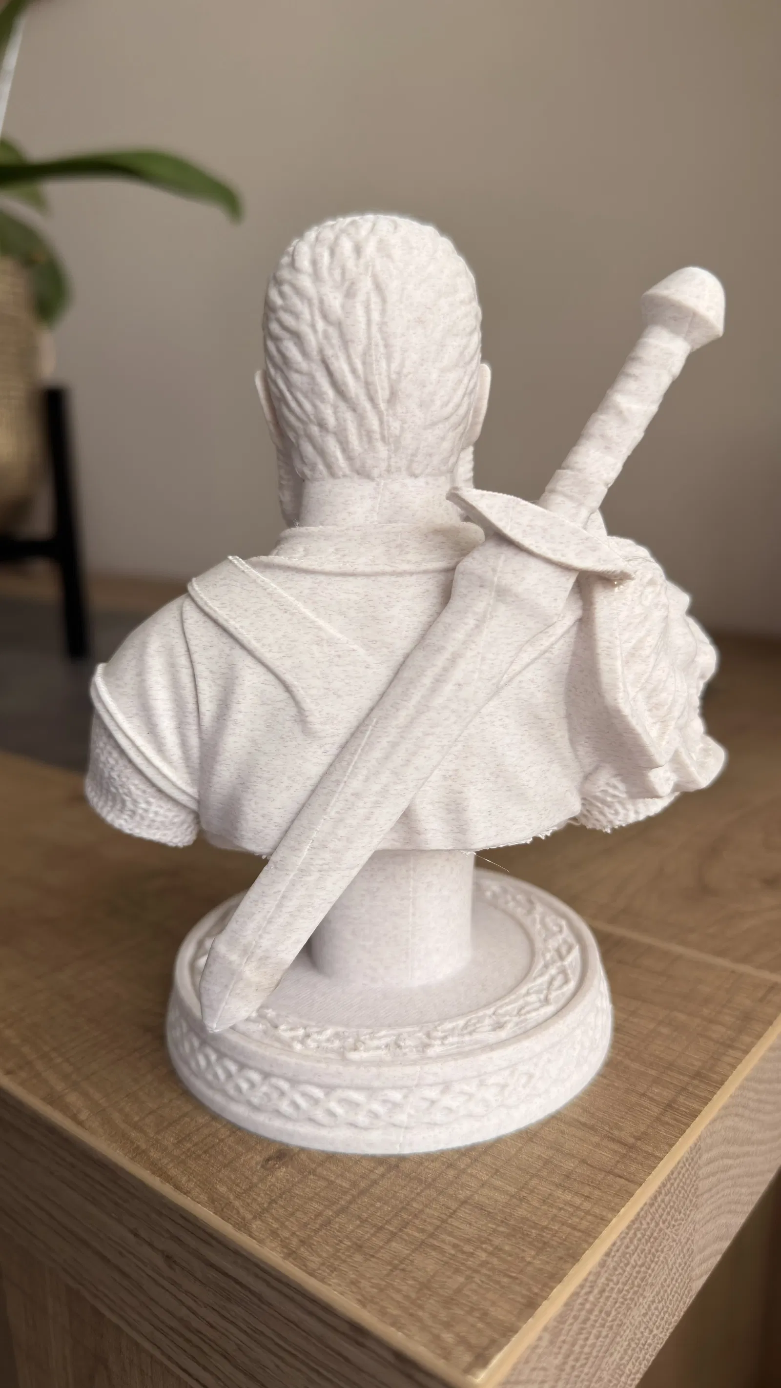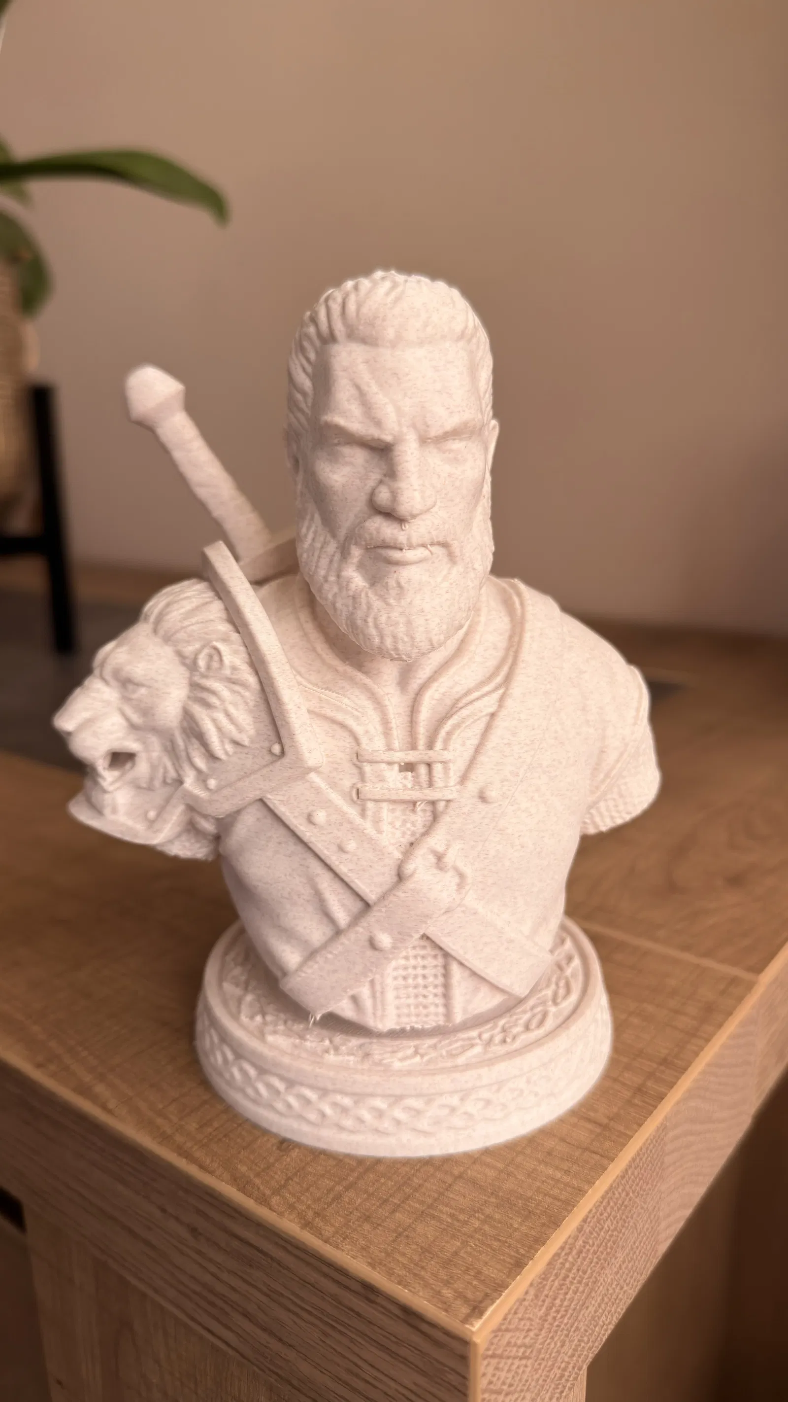 Warrior v.3 là phiên bản bust fantasy trưởng thành và chi tiết hơn: biểu cảm tập trung, râu tỉa kỹ, giáp nhiều texture, kiếm sau lưng, vai có trophy và đế hoa văn đan xen. Hợp trưng bày, RPG tabletop và bối cảnh trung cổ.