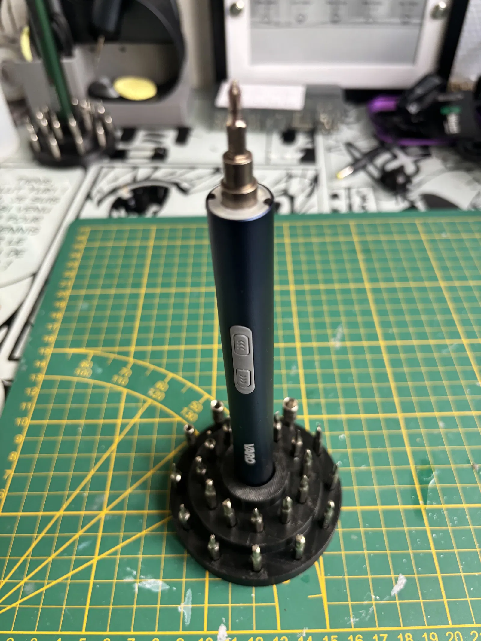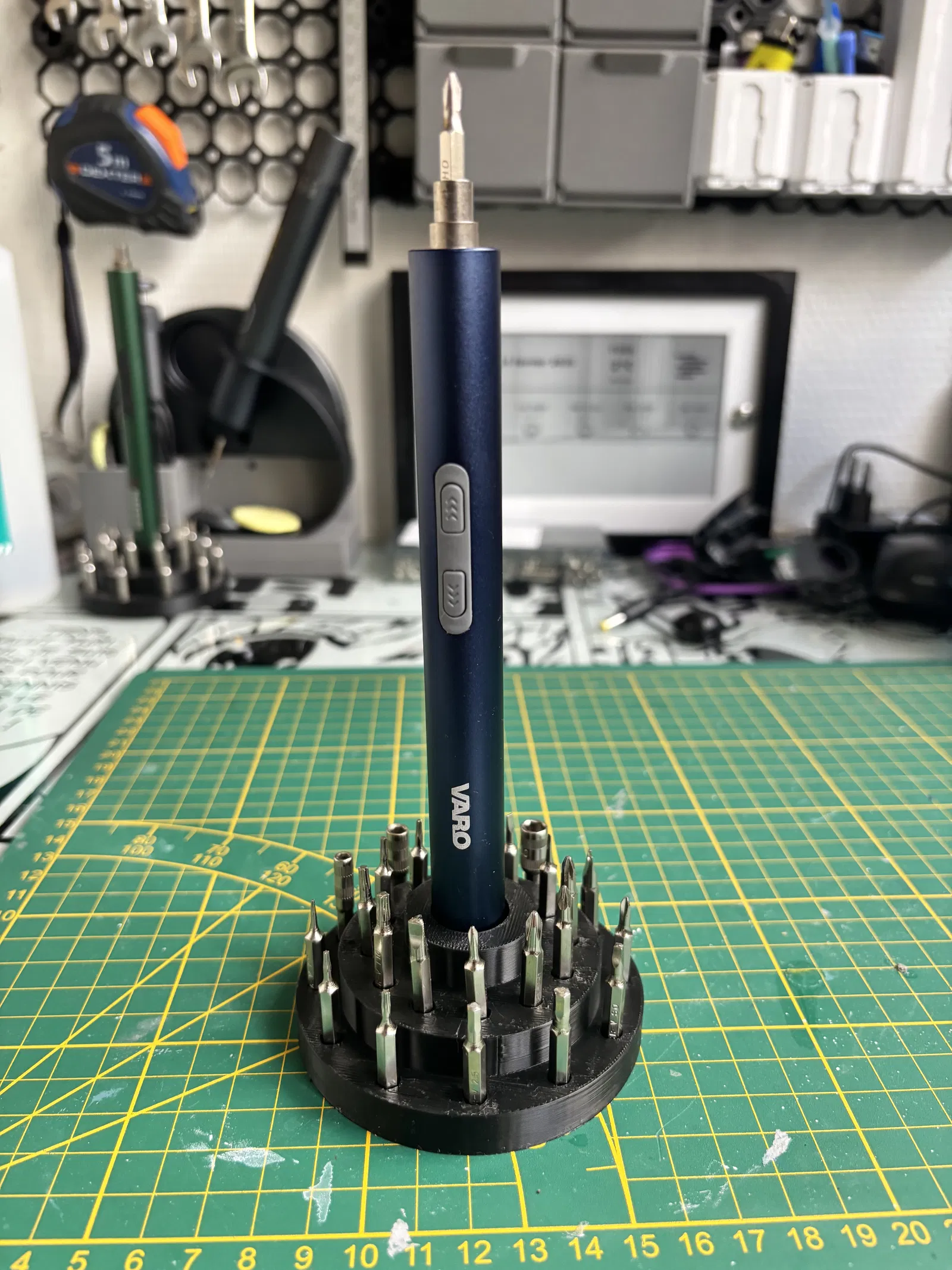 Giá đỡ (organiser) in 3D cho tua vít điện VARO VAR10080/25, thiết kế dựng đứng vững vàng và có ngăn cất đầu bits quanh thân. Giúp góc làm việc gọn gàng, thay bits nhanh, luôn sẵn sàng sử dụng.