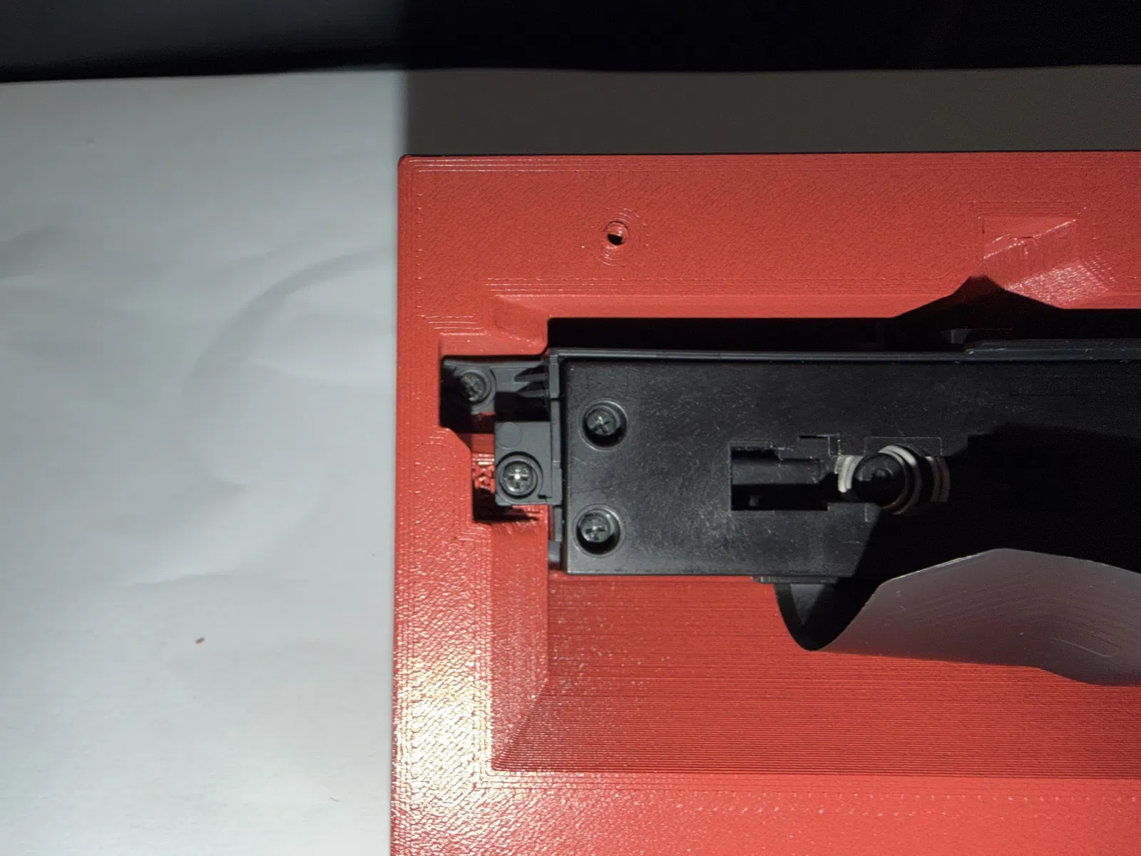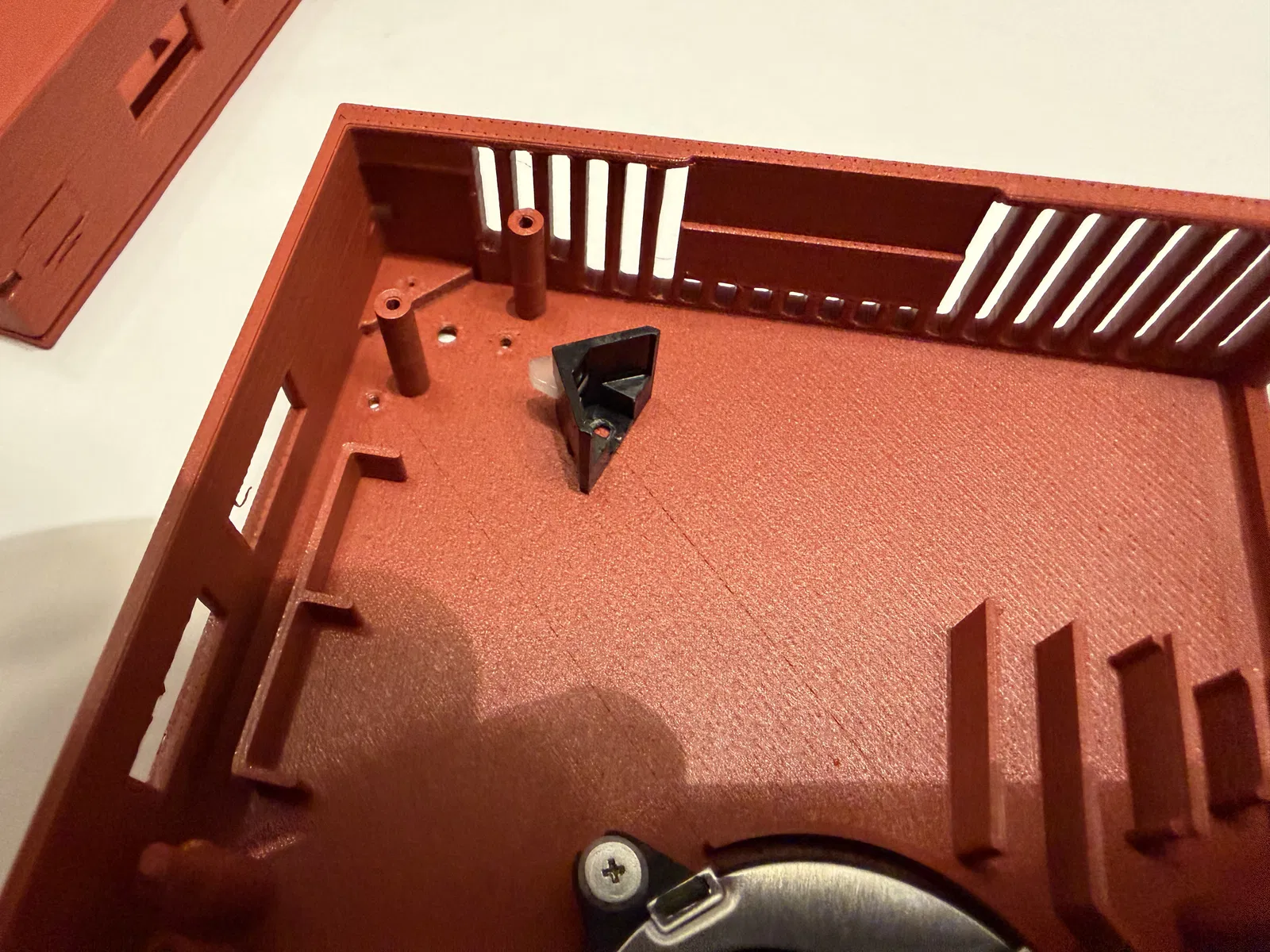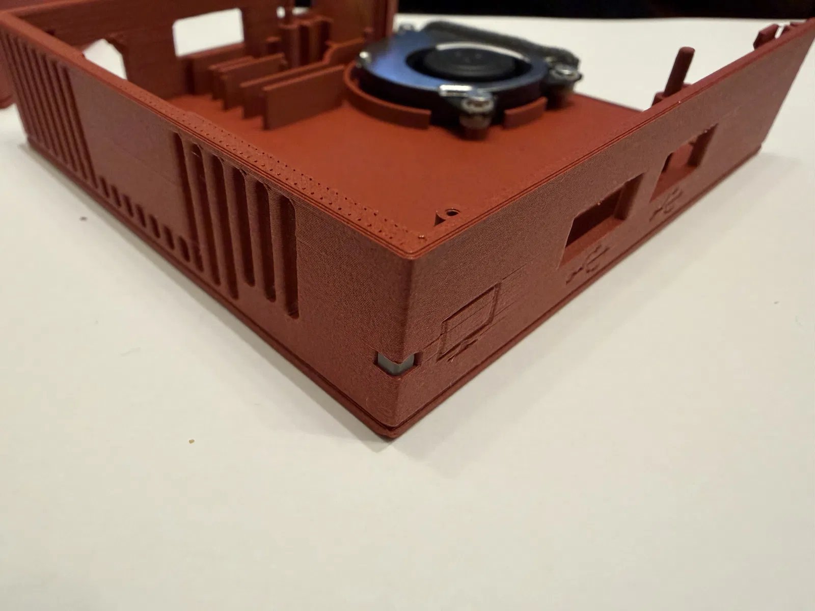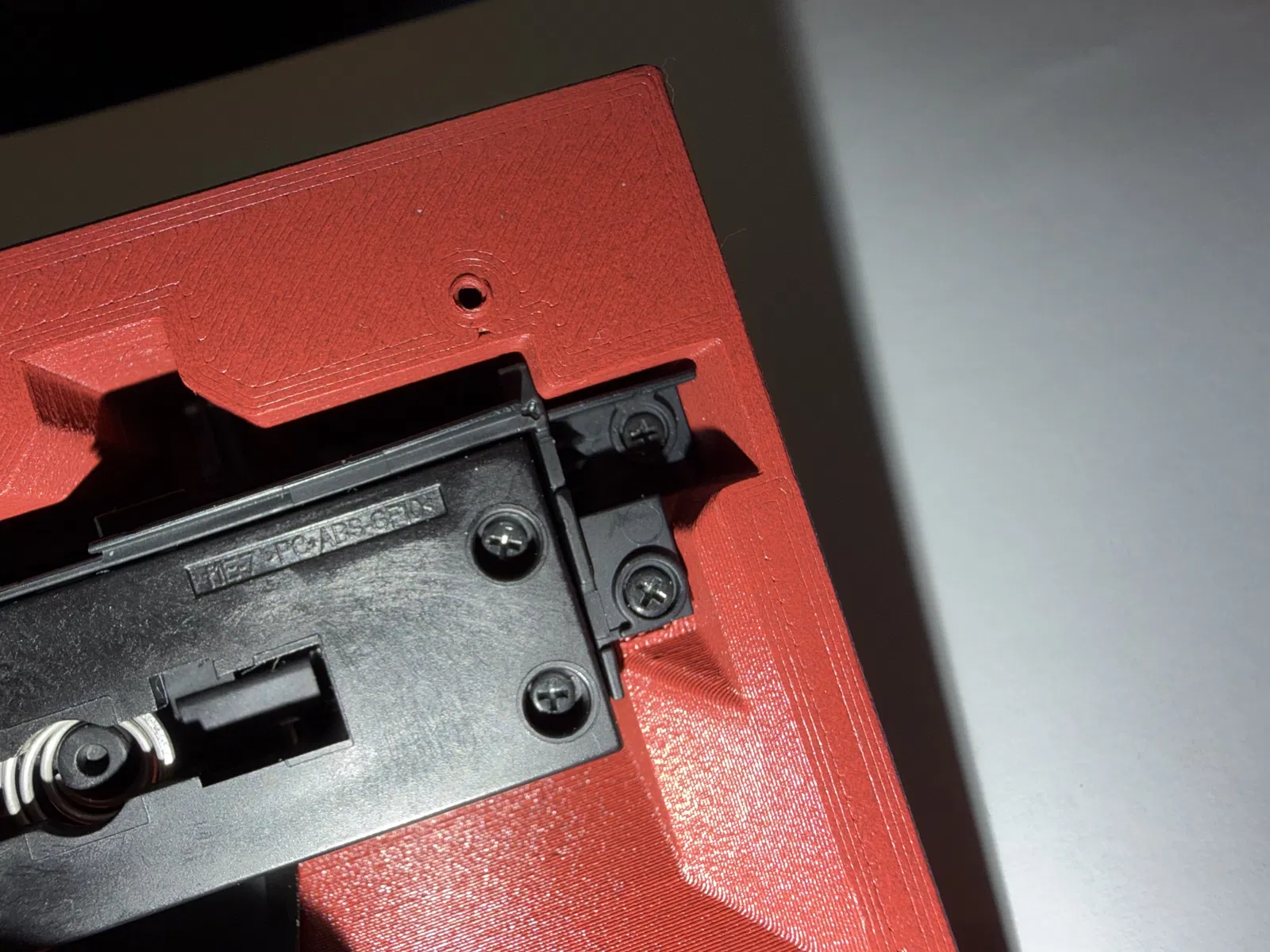 Một góc có snap fit vì đầu nối mạng (network connector) không chừa chỗ cho thêm ốc. Với mình thì bấm khớp góc đó trước là dễ nhất. -