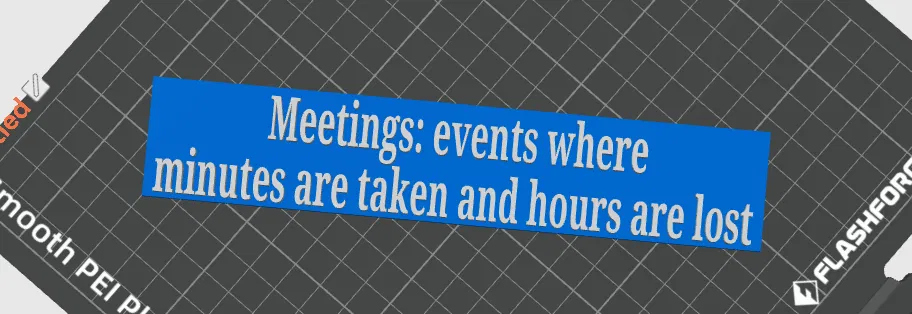 Thêm chút hài hước và suy ngẫm vào không gian làm việc với mô hình 3D "Văn Phòng Thông Thái: Cuộc Họp". Chiếc biển độc đáo này mang thông điệp "Meetings: events where minutes are taken and hours are lost" (Cuộc họp: nơi biên bản được ghi lại và thời gian bị lãng phí), phản ánh một thực tế dí dỏm về các cuộc họp. Hoàn hảo để trang trí bàn làm việc, phòng họp hoặc làm quà tặng ý nghĩa cho đồng nghiệp. Dễ dàng in 3D với các vật liệu phổ biến như PLA, mang đến một vật phẩm trang trí vừa vui vẻ vừa nhắc nhở về việc quản lý thời gian hiệu quả. Biến những giờ họp căng thẳng thành những phút giây thư giãn với vật phẩm độc đáo này.