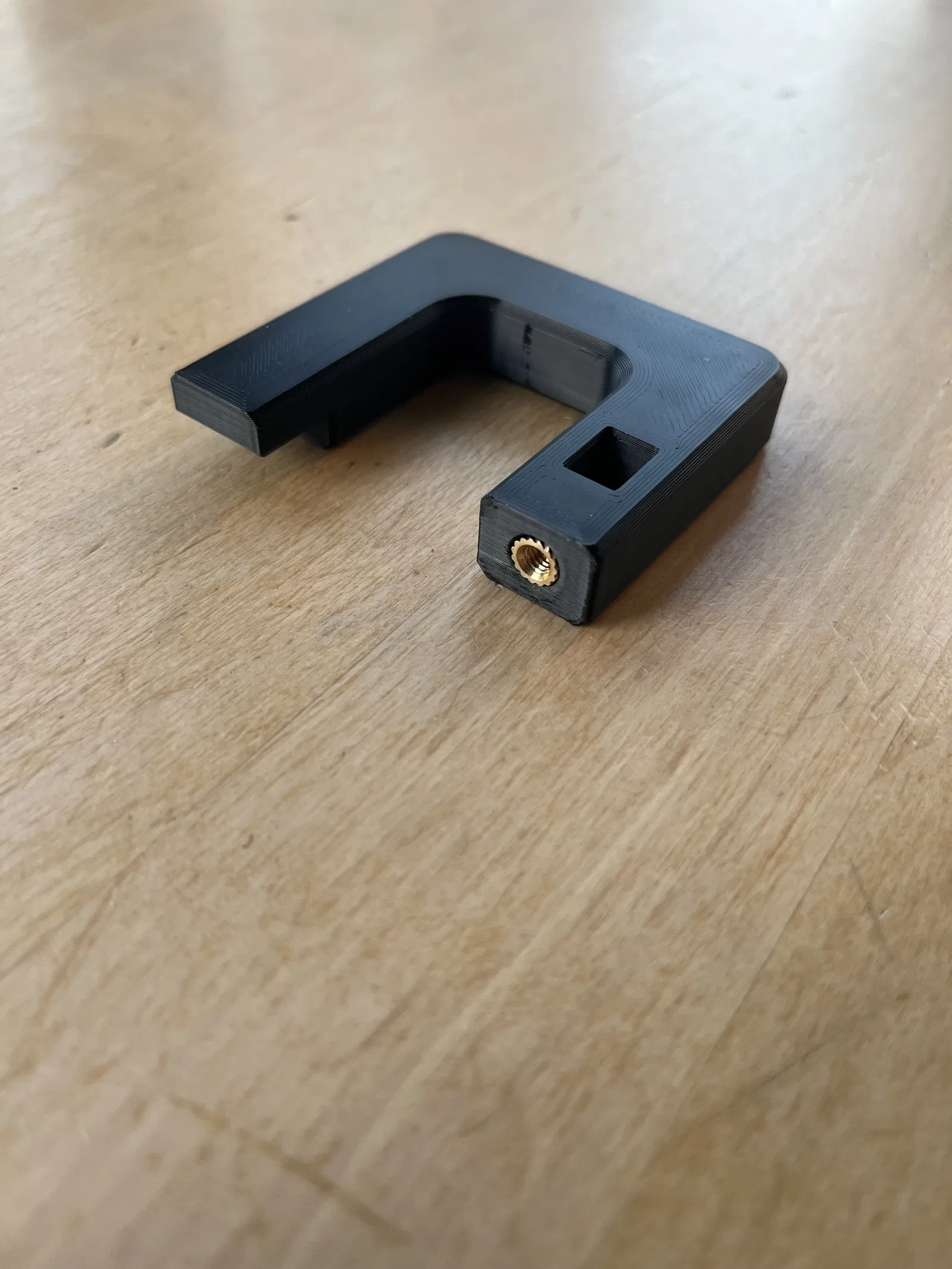 Luồn bu lông M4x20 qua long đền và heat-set insert để nó làm trục xoay (pivot point) cho móc treo